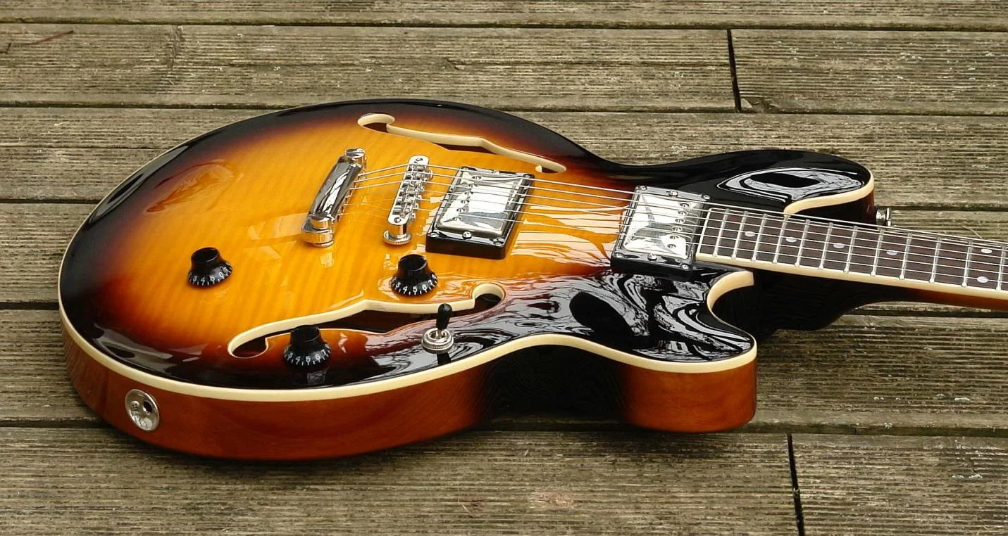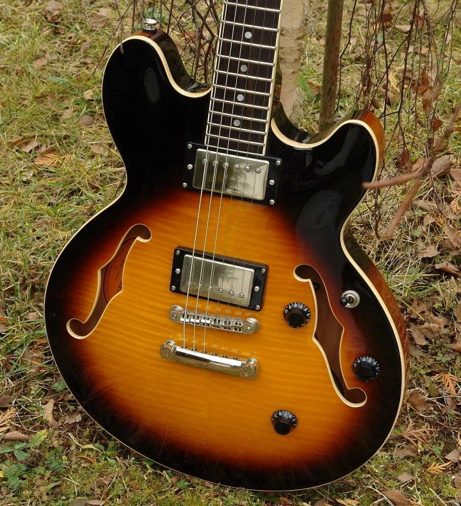 Die Pickups sind erst einmal nur eines - laut. Sie klingen in ihren Einzel- und Zwischenstellungen; egal ob clean oder gezerrt, ziemlich amtlich nach ES. Punkt. Nee, eigentlich nicht. Bauartbedingt fehlt der Gitarre das typische hölzerne Timbre einer ES-335 oder das Sirren und Schwirren einer Riviera mit ihrer speziellen Saitenaufhängung. Auch geht sie nicht so extrem direkt an den Start mit ihrer Tonentfaltung, wie z.B. eine ES-137. Sie hat bauartbedingt etwas - aber eben nur etwas - vom relativ Trägen einer Les Paul, sie ist spritzig, luftig und ich kann ihr eine schnelle Tonentfaltung attestieren, merklich in Richtung ES gehend, aber eben nicht zu 100%. Das gefiel mir außerordentlich.