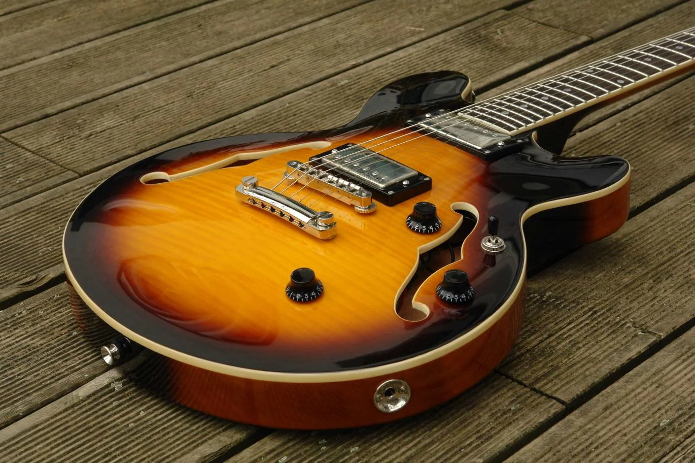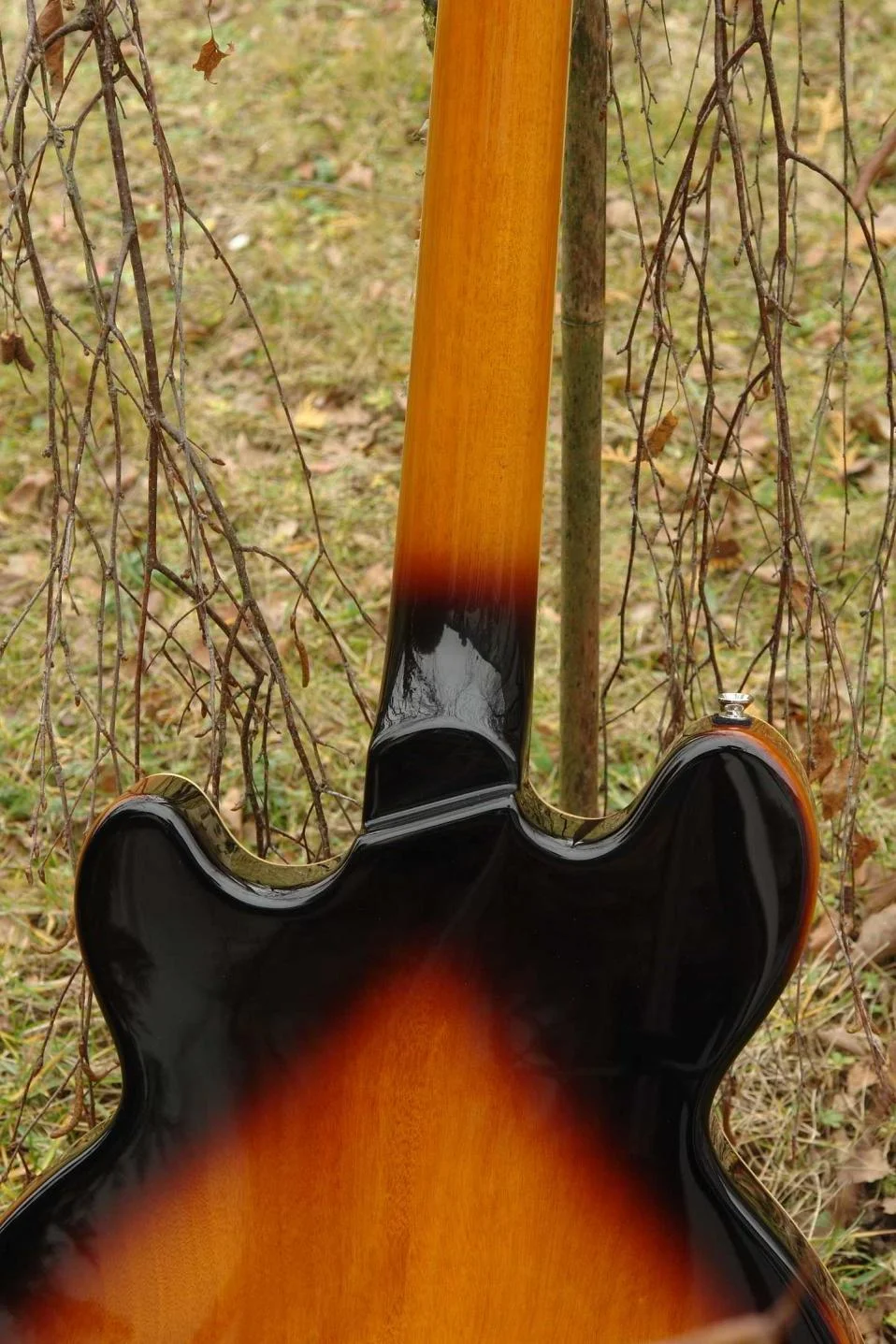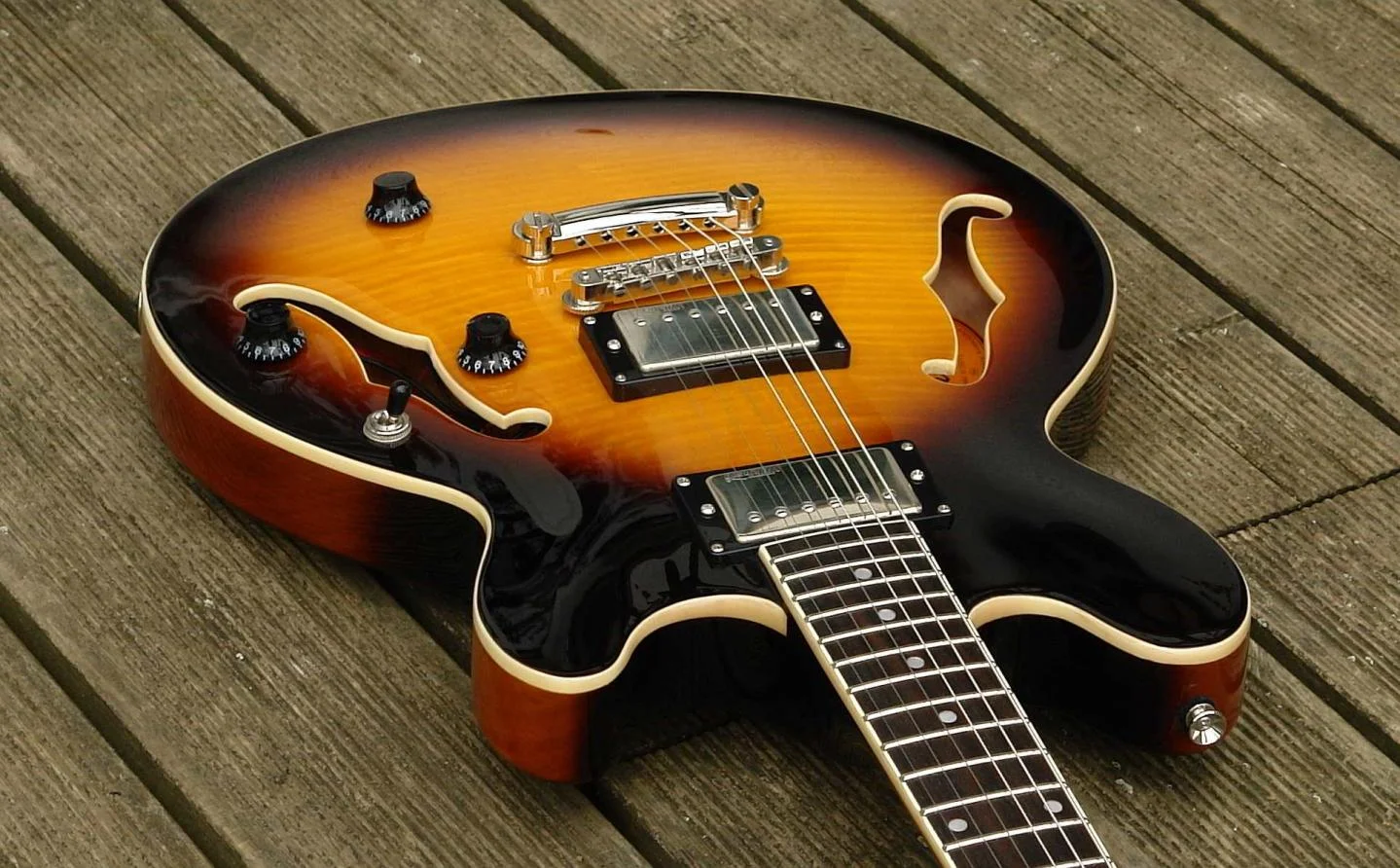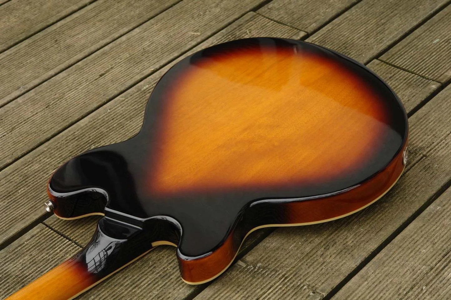 ) wird ein Blick in den Korpus frei, der Rand mißt ca. 14 mm. Auf dem Korpus findet man eine Ahorndecke, darauf ein aufgeleimtes hübsches Furnier würde ich mal sagen. Rötlich-bräunliches, dezentes Sunburst. Abgerundet durch ein gelbliches, vergilbt wirkendes Binding - der optische Eindruck ist zurückhaltend und angenehm. Donnerwetter: ein geöltes Griffbrett. Jau, ich hatte zwei, drei Tage zu tun, den ranzigen Geruch auf den Fingern wegzubekommen...