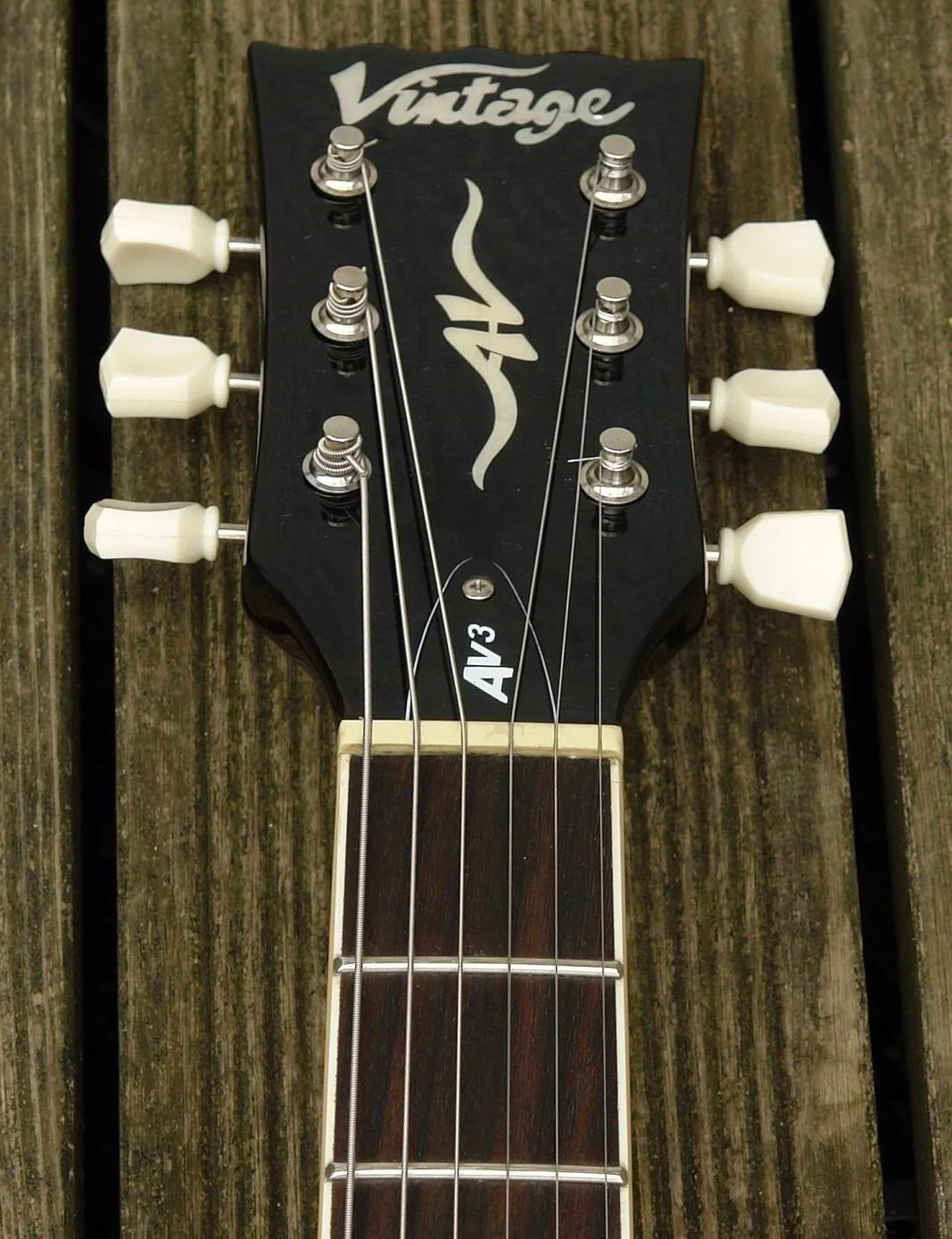 Die Vintage AV3 kam mit einer extremen, zu tief eingestellte Saitenlage als Werksauslieferung. Dünne, ebenfalls mit diesem ranzig riechenden Zeug geölte Irgendwas-Drähte waren drauf, aber ok, das wird ohnehin entfernt, neu geölt, mit meinen D'Addario 010er Saiten bespannt und Saitenhöhe und Halskrümmung neu justiert. Jepp, den Satz Saiten habe ich geopfert.
