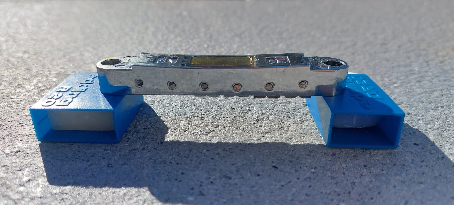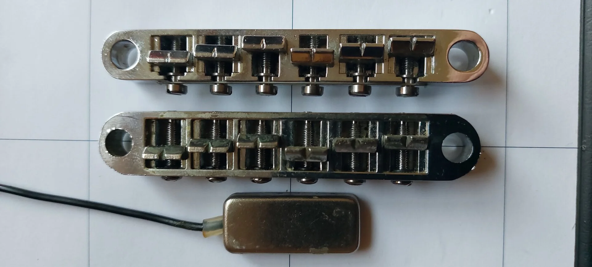 Durch den Einbau eines Kahler K7200-Vibratosteges in "Paulus" Anfang 2024 war ja dessen Steg incl. dem darunter positionierten Shadow SH-020 übrig geblieben und somit frei zur nächsten Verwendung. Es wäre natürlich absolute Fügung, wenn auch bei dieser Gitarre bei passend eingestellter Saitenlage der Abstand zwischen Stegunterseite und Decke zur Dicke des SH-020 passen würde! Ja, das wäre es. Dann wäre es definitiv auch ein Zeichen für mich, dass ich den Steg auf dieser Gitarre weiter verwenden soll.Ein erster Blick sagte mir: Das könnte passen. also entspannte ich die Saiten, nahm den Originalsteg runter, steckte den alten Steg von "Paulus" auf die Einstellschrauben, legte die Saiten auf, stellte die Saitenhöhe ein und schob den Piezo zwischen Steg und Decke rein und hatte gerade mal ein paar Zehntel Luft. Echt krass! Für manche ist das Zufall, für mich ist es Führung. Jetzt müsste der Piezo nur noch gut klingen! Also packte ich über und unter ihn eine ganz dünne Schicht der damals beiliegenden Montageknetemasse, positionierte ihn damit in der Mitte unter dem in diesem Teil begradigten Steg, schob diesen auf die Einstellschrauben, zog die Saiten wieder auf und machte einen provisorischen Klangtest über meinen Marshall AS50D. Der Klang war eher leise, sehr höhenreich und bassarm, könnte aber gut den Klang der Humbucker ergänzen. Also schloss ich den Ausgang der Gitarre zusätzlich am zweiten Eingang des AS50D an und mischte beide Signale. Je nach Schaltung der Humbucker klang das richtig gut "akustisch".