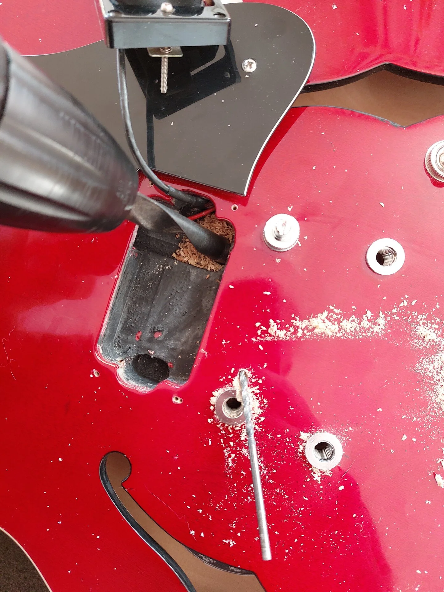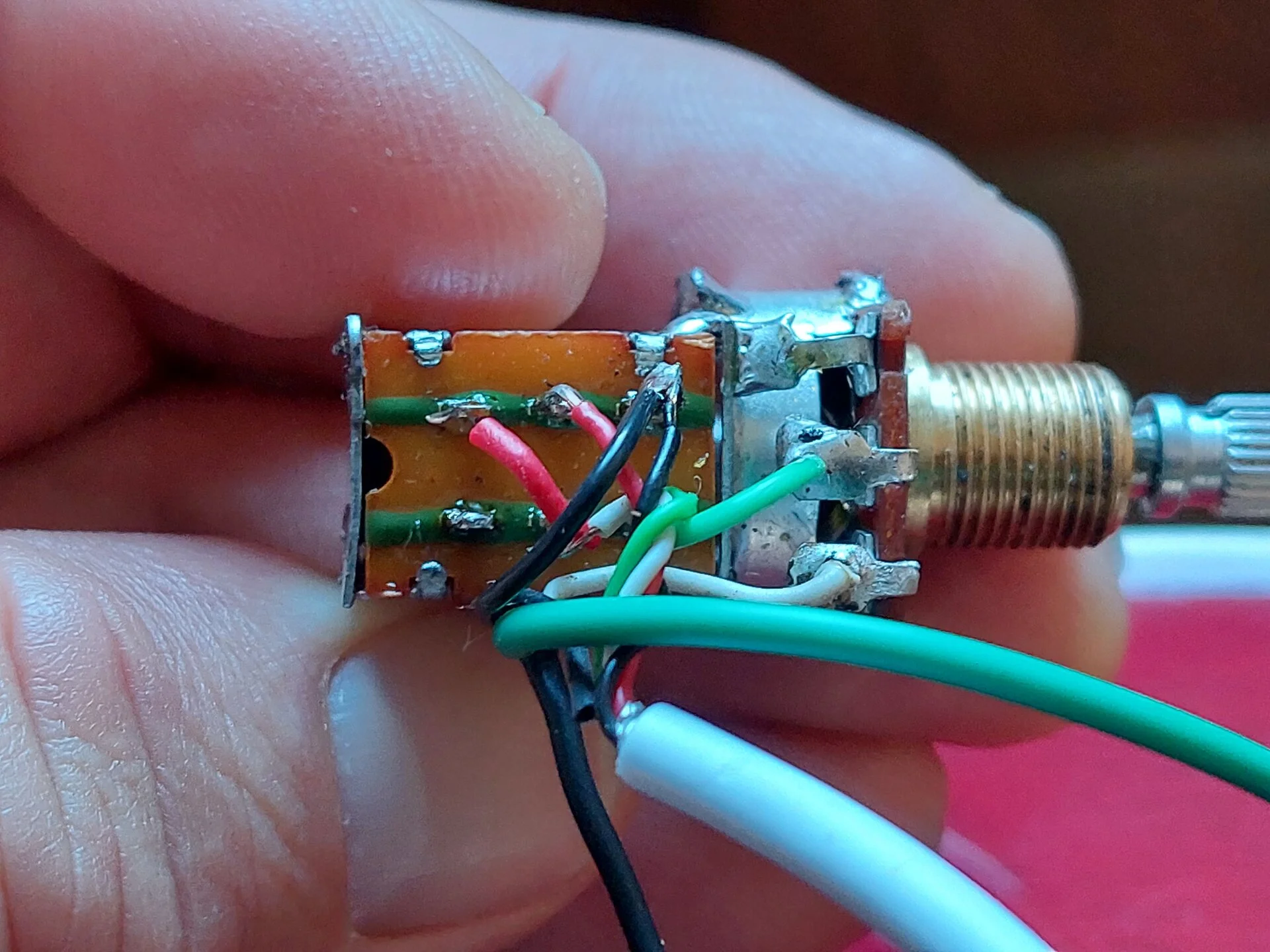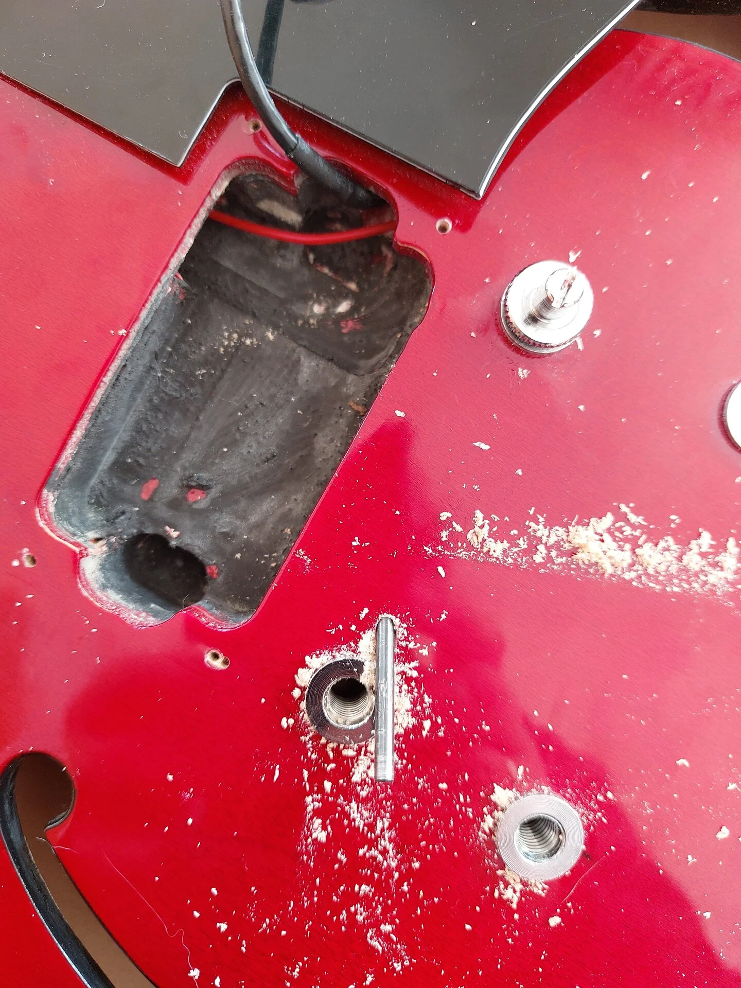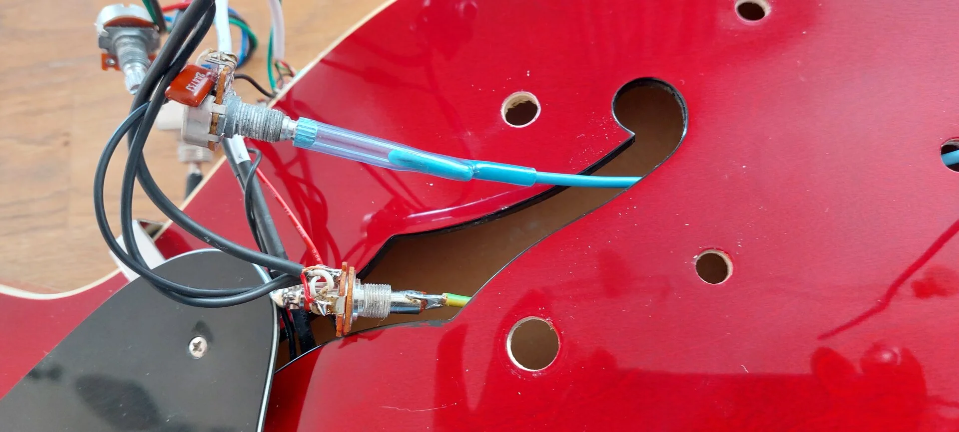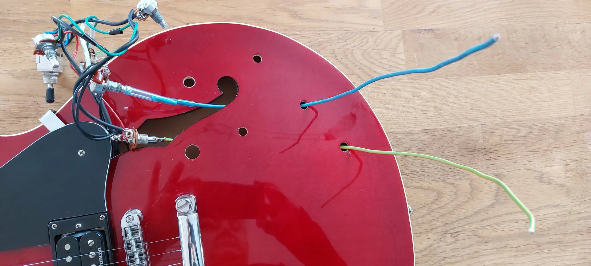 Mit diesen Drähten kann man in das Zielloch einfädeln und wieder aus dem F-Loch ausfädeln und dort dann die Potiachse, bzw. die Klinkenbuchse einstecken und dann über den Draht geführt durch das F-Loch in den Korpus einfädeln und gezielt wieder aus dem Zielloch austauchen. Dort kann man dann die Unterlegscheiben und Muttern über den Draht fädeln und auf die Gewinde aufschrauben. Um die Muttern bei den Potis festziehen zu können, muss man diese gleichzeitig auf Endanschlag gedreht mit einer Zange festhalten. Bei der Buchse ist es etwas kniffliger. Da habe ich meinen Elektronikschneider so in die Buchse reingedrückt, dass ich die Mutter festziehen konnte.