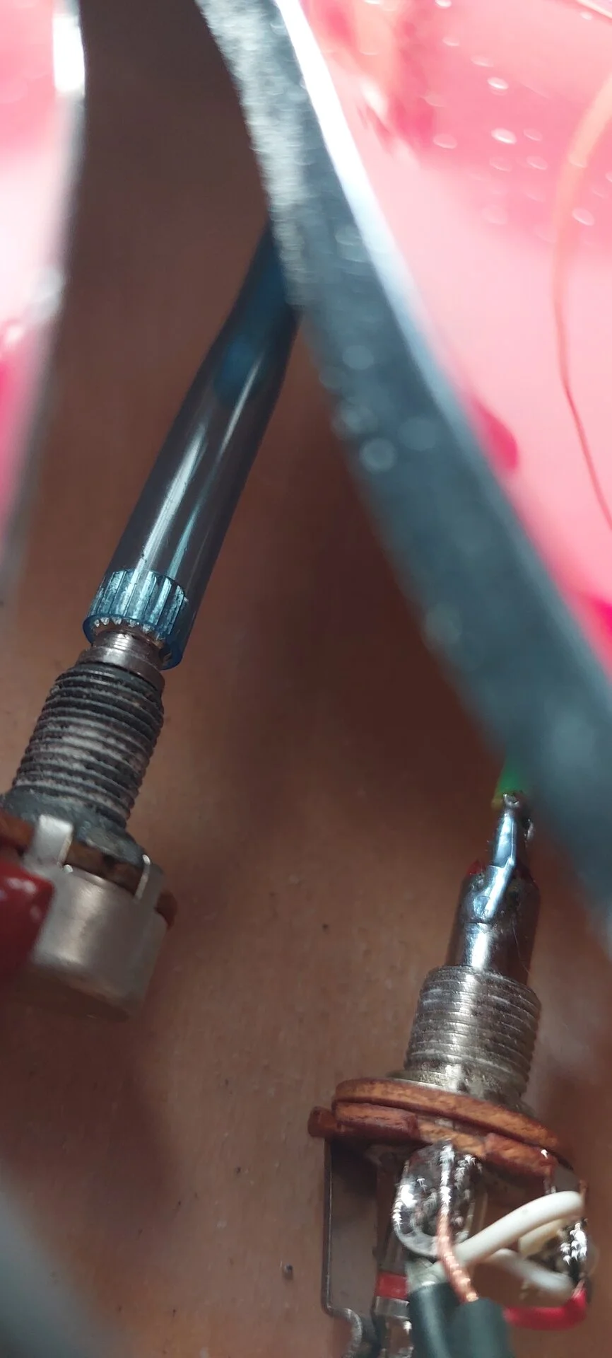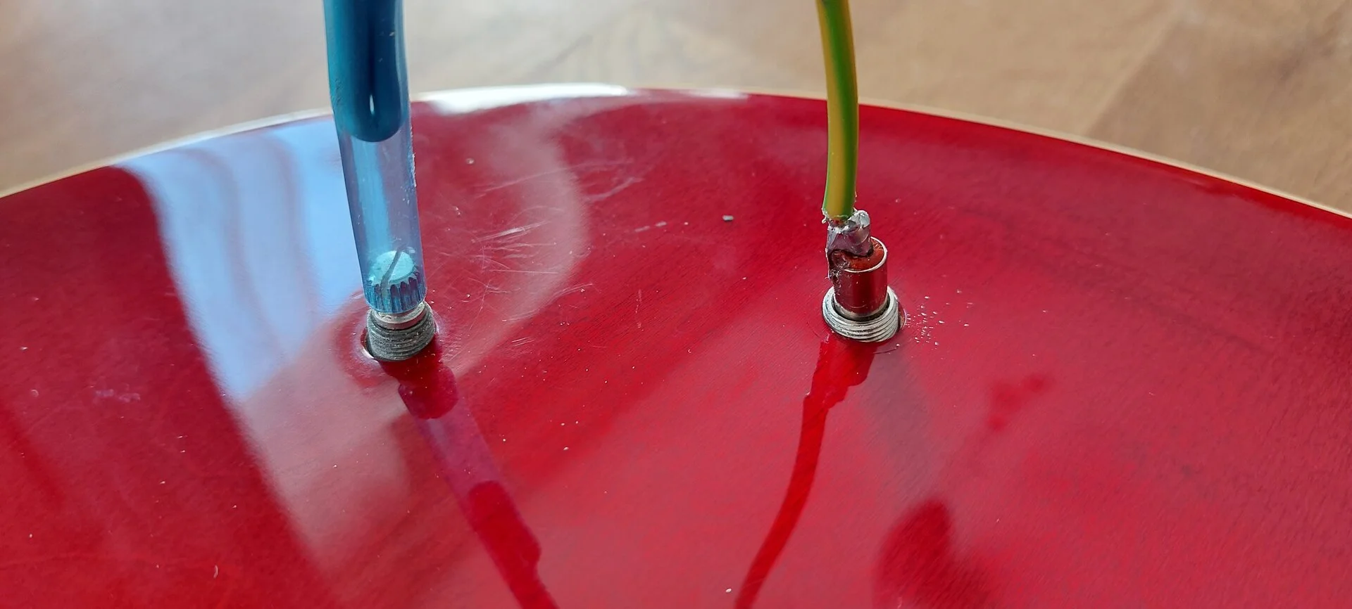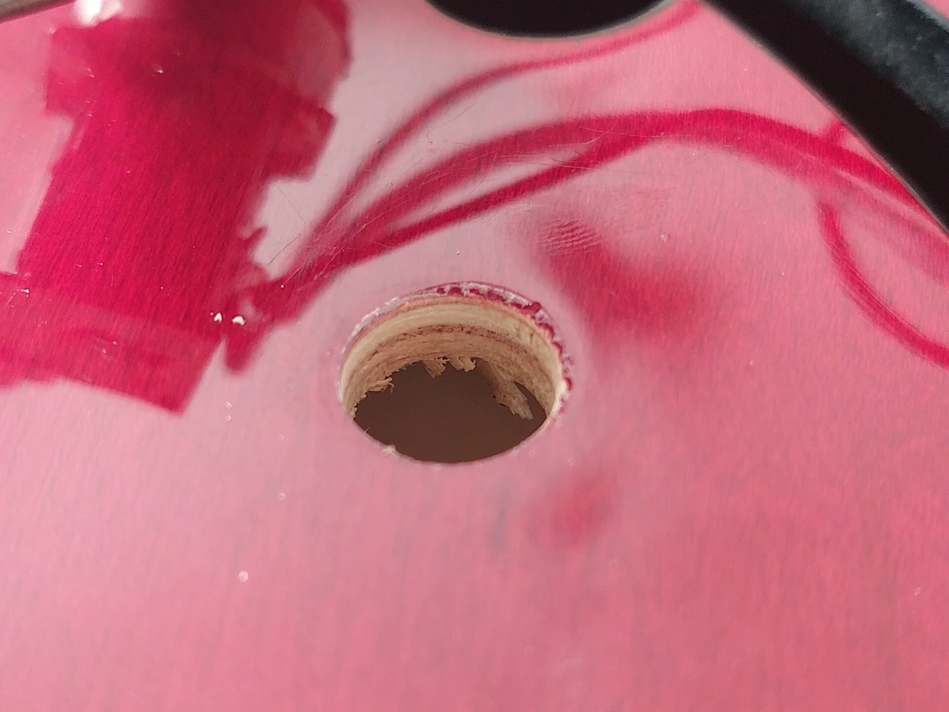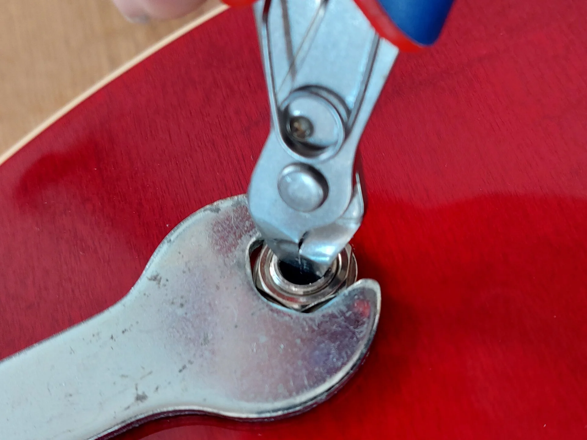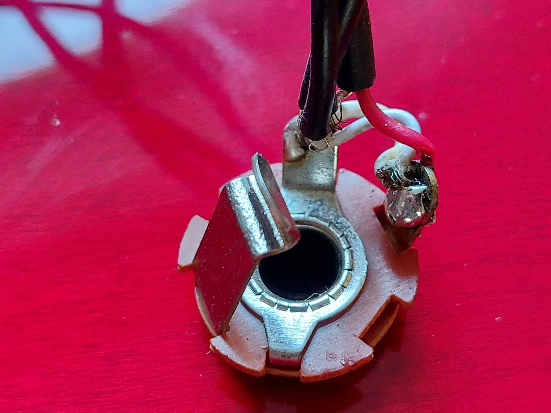 Mit diesen Drähten kann man in das Zielloch einfädeln und wieder aus dem F-Loch ausfädeln und dort dann die Potiachse, bzw. die Klinkenbuchse einstecken und dann über den Draht geführt durch das F-Loch in den Korpus einfädeln und gezielt wieder aus dem Zielloch austauchen. Dort kann man dann die Unterlegscheiben und Muttern über den Draht fädeln und auf die Gewinde aufschrauben. Um die Muttern bei den Potis festziehen zu können, muss man diese gleichzeitig auf Endanschlag gedreht mit einer Zange festhalten. Bei der Buchse ist es etwas kniffliger. Da habe ich meinen Elektronikschneider so in die Buchse reingedrückt, dass ich die Mutter festziehen konnte.