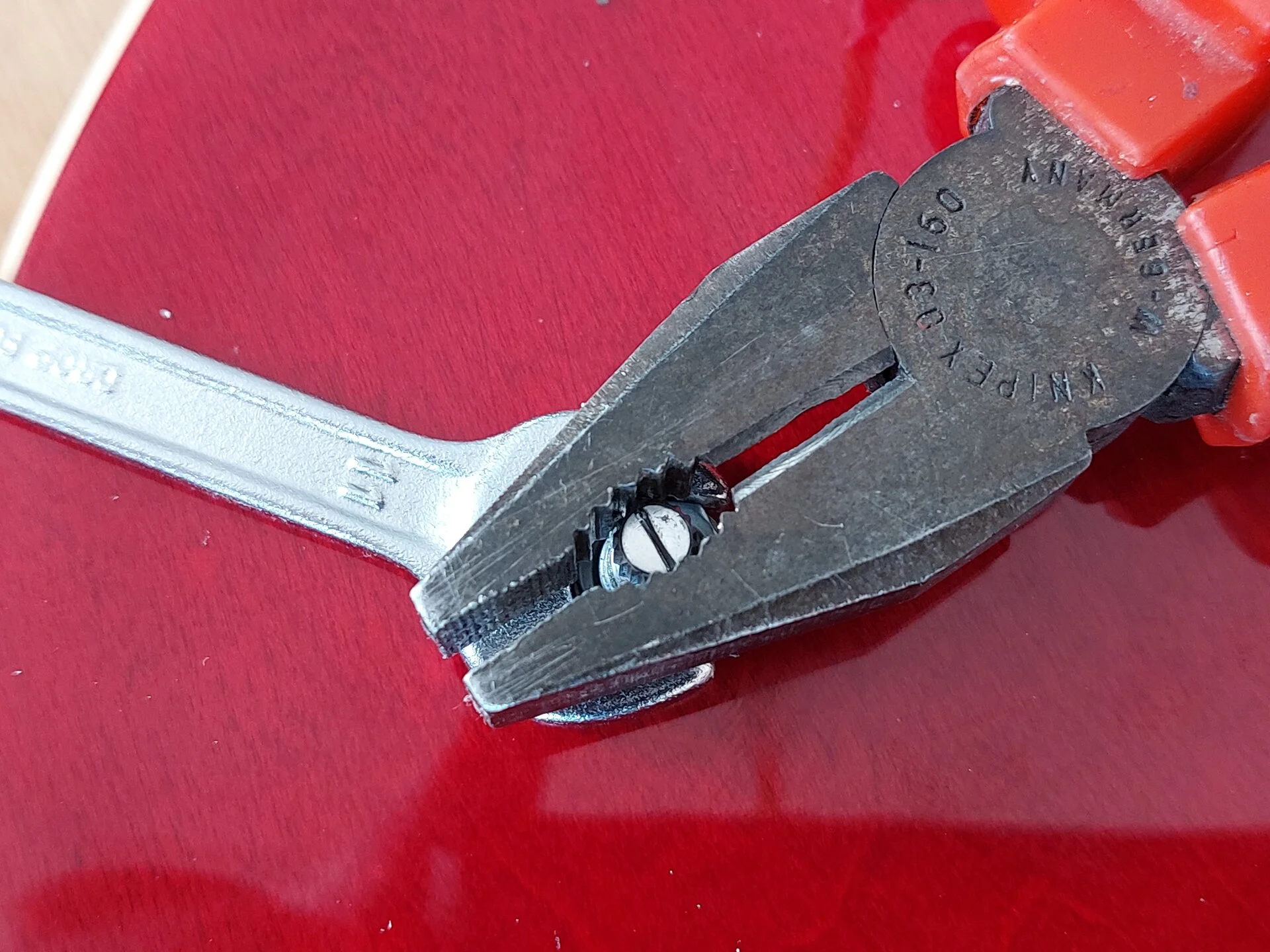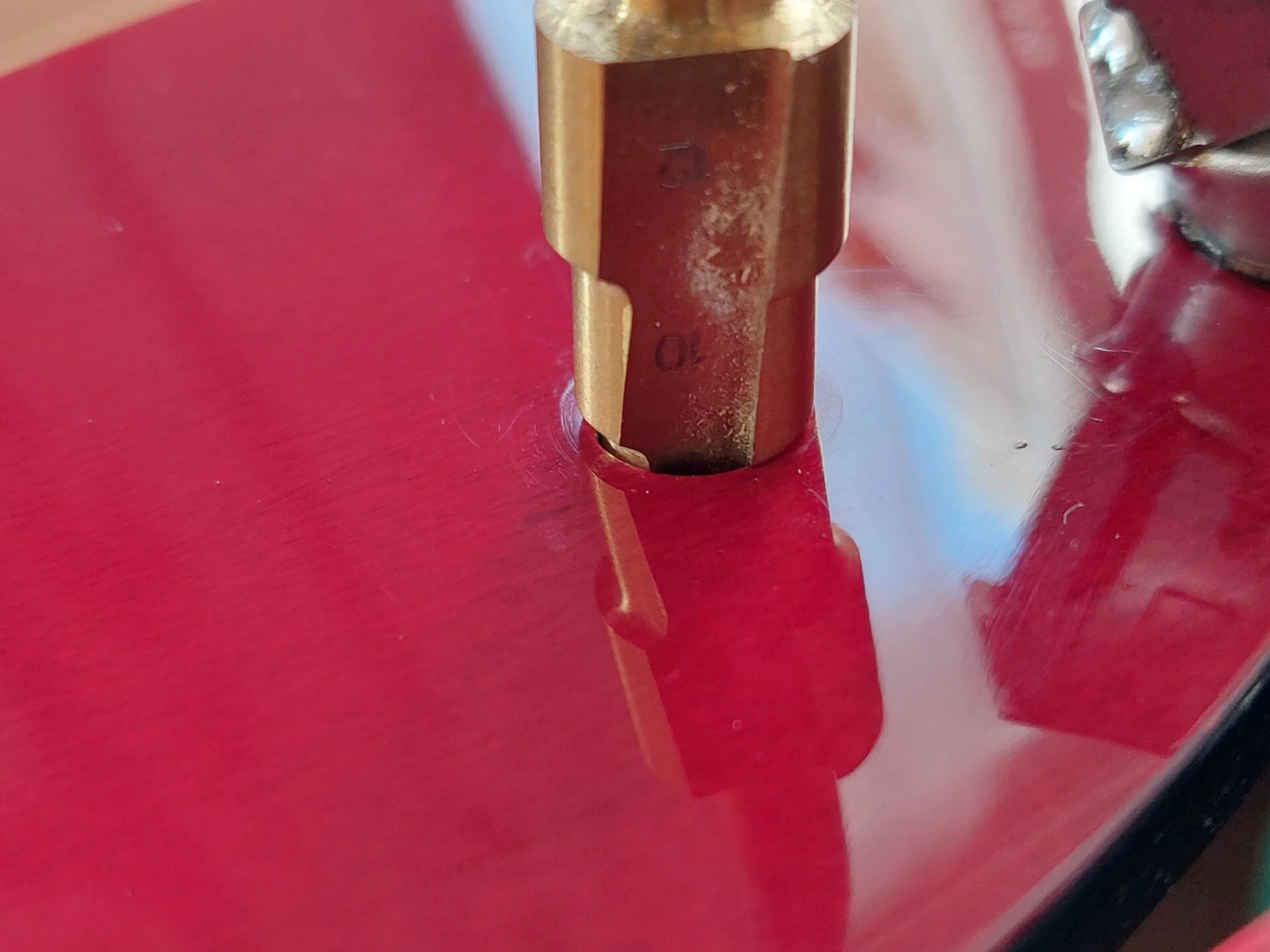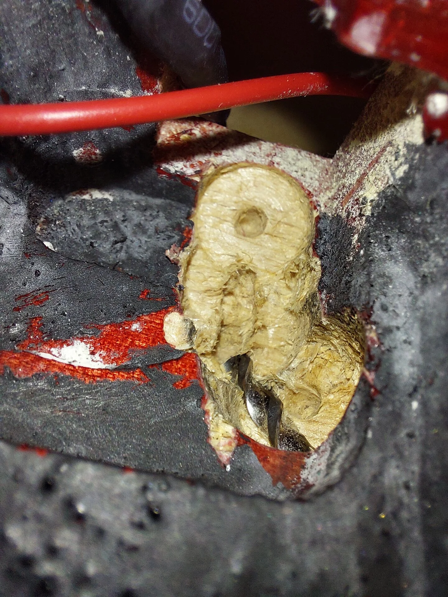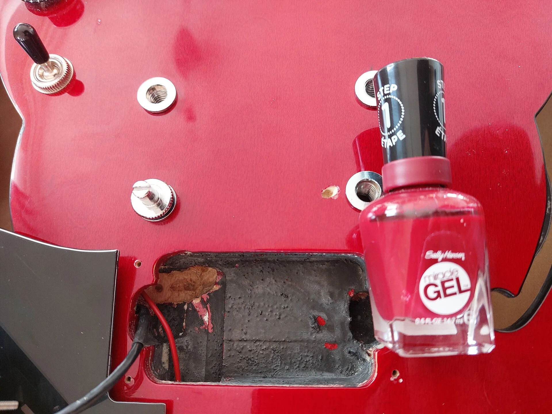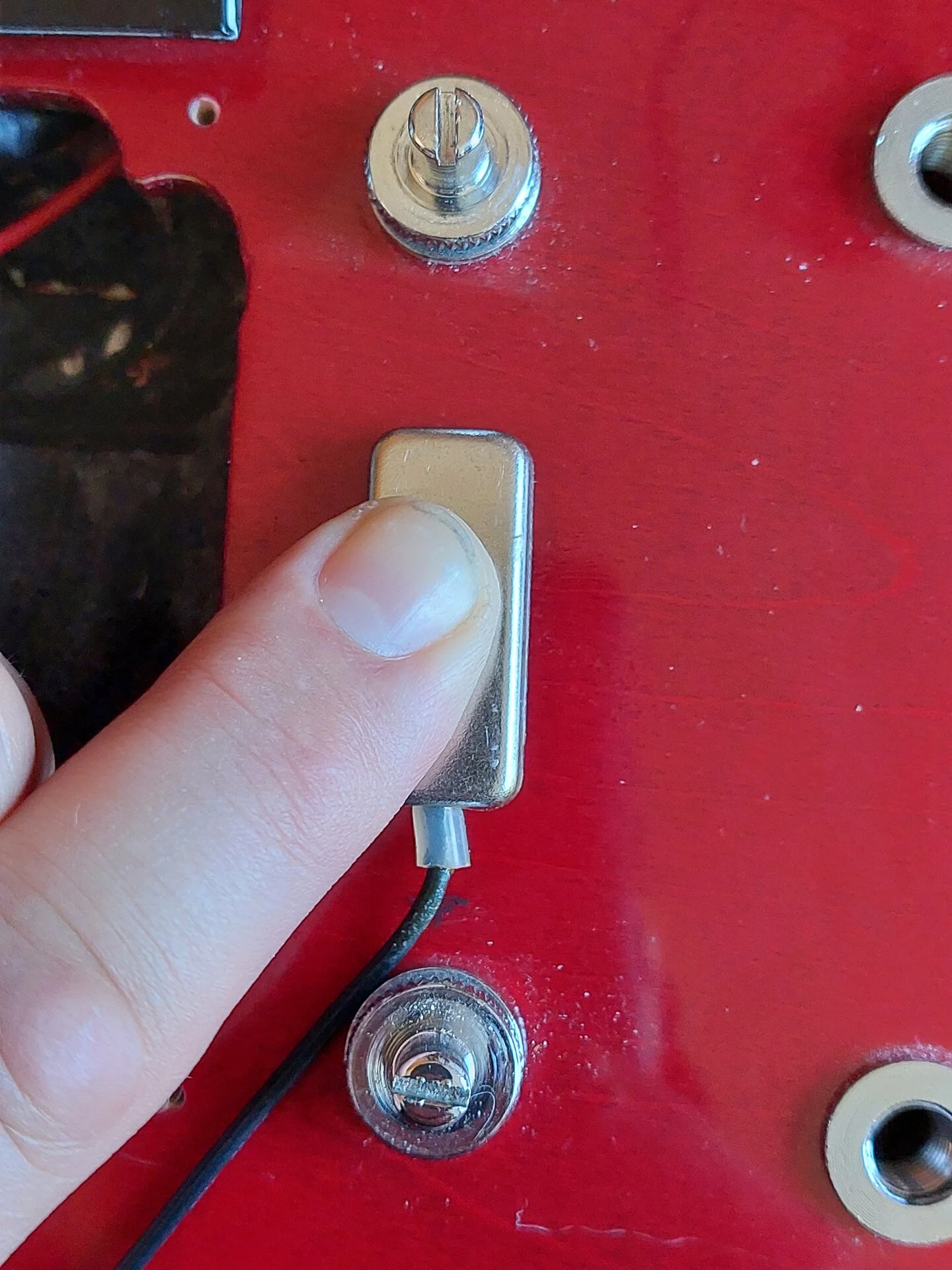 Mit diesen Drähten kann man in das Zielloch einfädeln und wieder aus dem F-Loch ausfädeln und dort dann die Potiachse, bzw. die Klinkenbuchse einstecken und dann über den Draht geführt durch das F-Loch in den Korpus einfädeln und gezielt wieder aus dem Zielloch austauchen. Dort kann man dann die Unterlegscheiben und Muttern über den Draht fädeln und auf die Gewinde aufschrauben. Um die Muttern bei den Potis festziehen zu können, muss man diese gleichzeitig auf Endanschlag gedreht mit einer Zange festhalten. Bei der Buchse ist es etwas kniffliger. Da habe ich meinen Elektronikschneider so in die Buchse reingedrückt, dass ich die Mutter festziehen konnte.