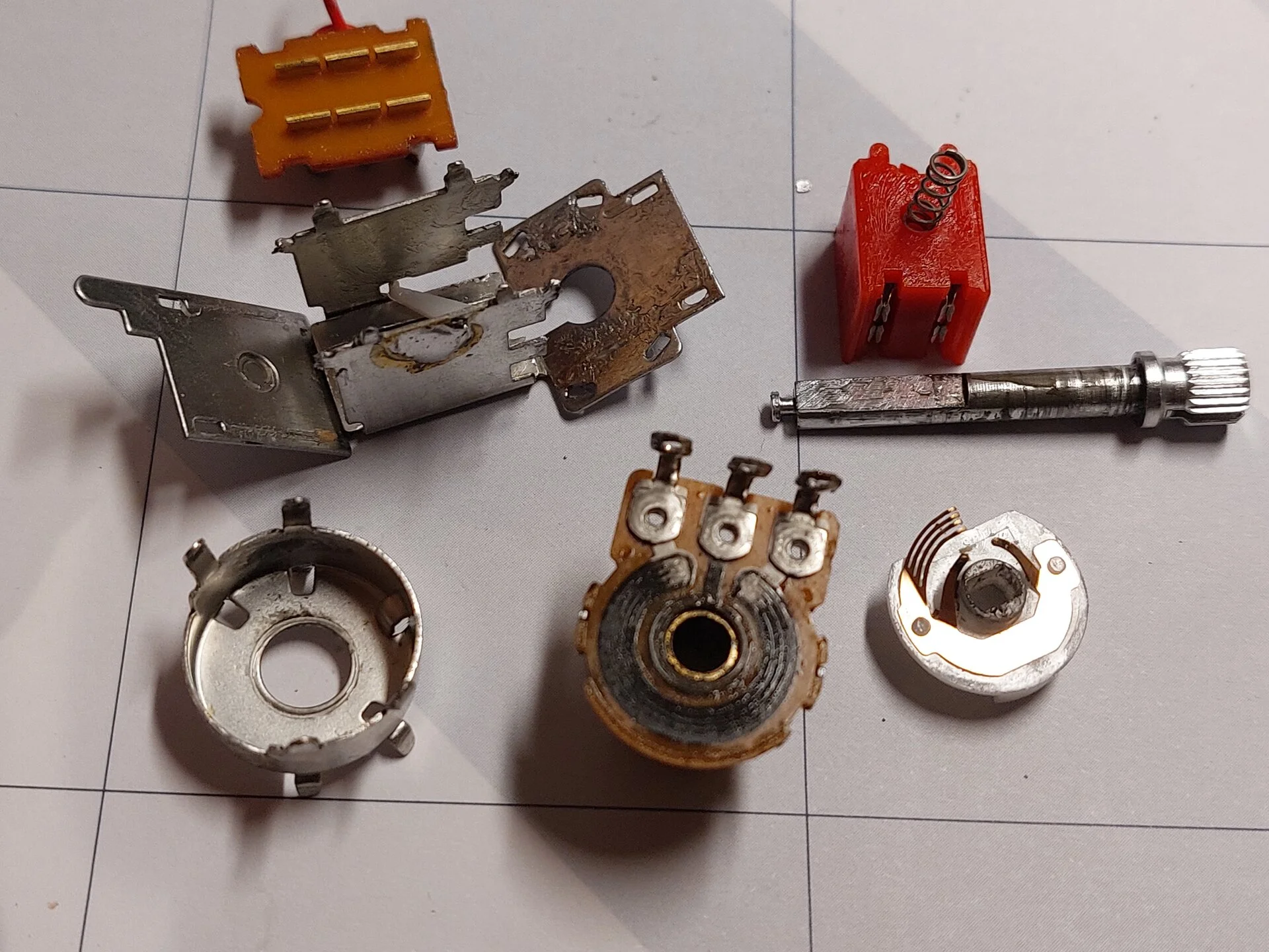 Bevor ich einen weiteren Push/Push-Poti für die Vintage VSA535 kaufen würde, schaute ich in den defekten rein um sicher zu stellen, dass er irreparabel defekt ist.Ich entlötete also die Lötpunkte, bog die Blechnasen zurück und zerlegte den Push/Push in seine Einzelteile.
