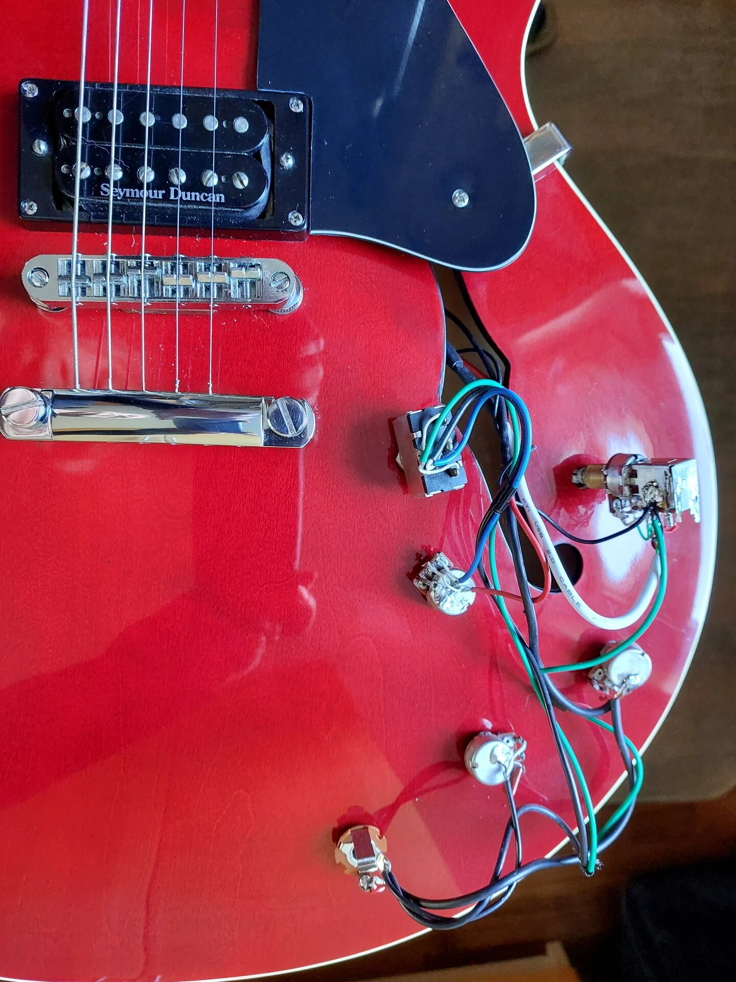Ich war echt froh, dass ich nun so unverhofft auch noch die Seriell-/Parallel-Schaltung der Humbuckerspulen umsetzen durfte!Die Schaltung ist ja sehr einfach und ist unter anderem auch auf den Seiten von Thomann ganz gut beschrieben: Dual Sound.
