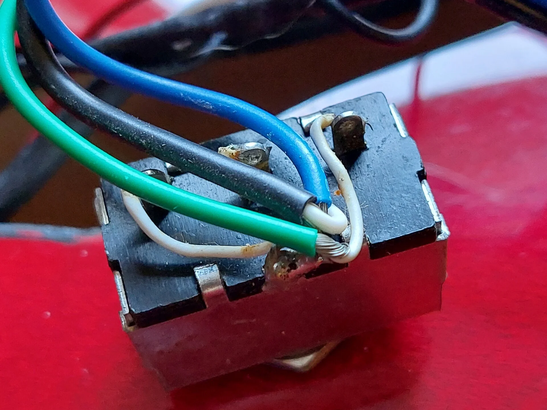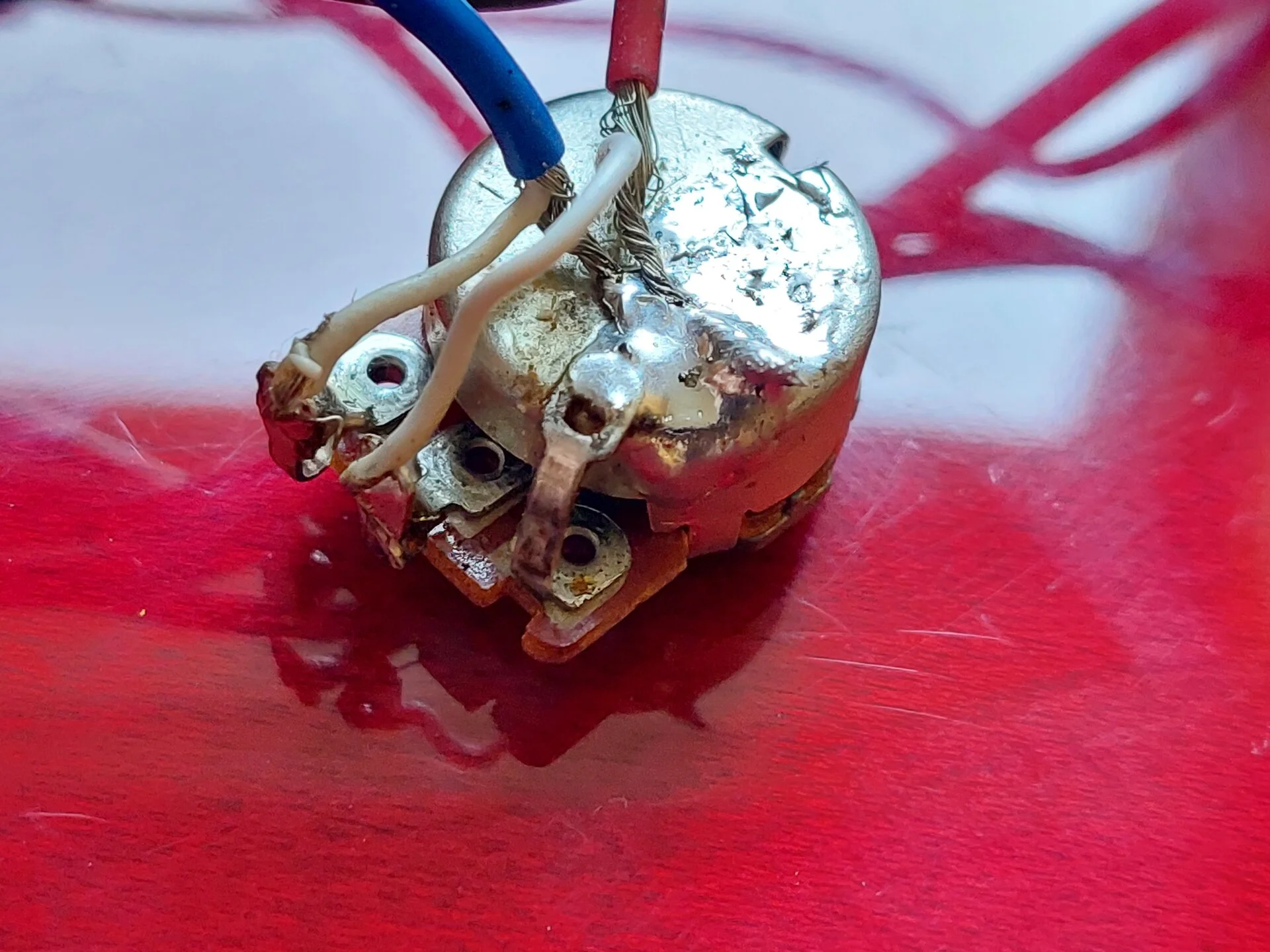 Aber der defekte Push/Push-Poti, den ich im März 2022 aus "Nr.2" ausbauen musste und als Garantiefall von Thomann ersetzt bekam und nicht zurückschicken musste, lag ja noch in meiner Schublade. Wenn ich den irgendwie reparieren könnte, wäre er für die Seriell-/Parallel-Schaltung des Steghumbuckers eine Option.