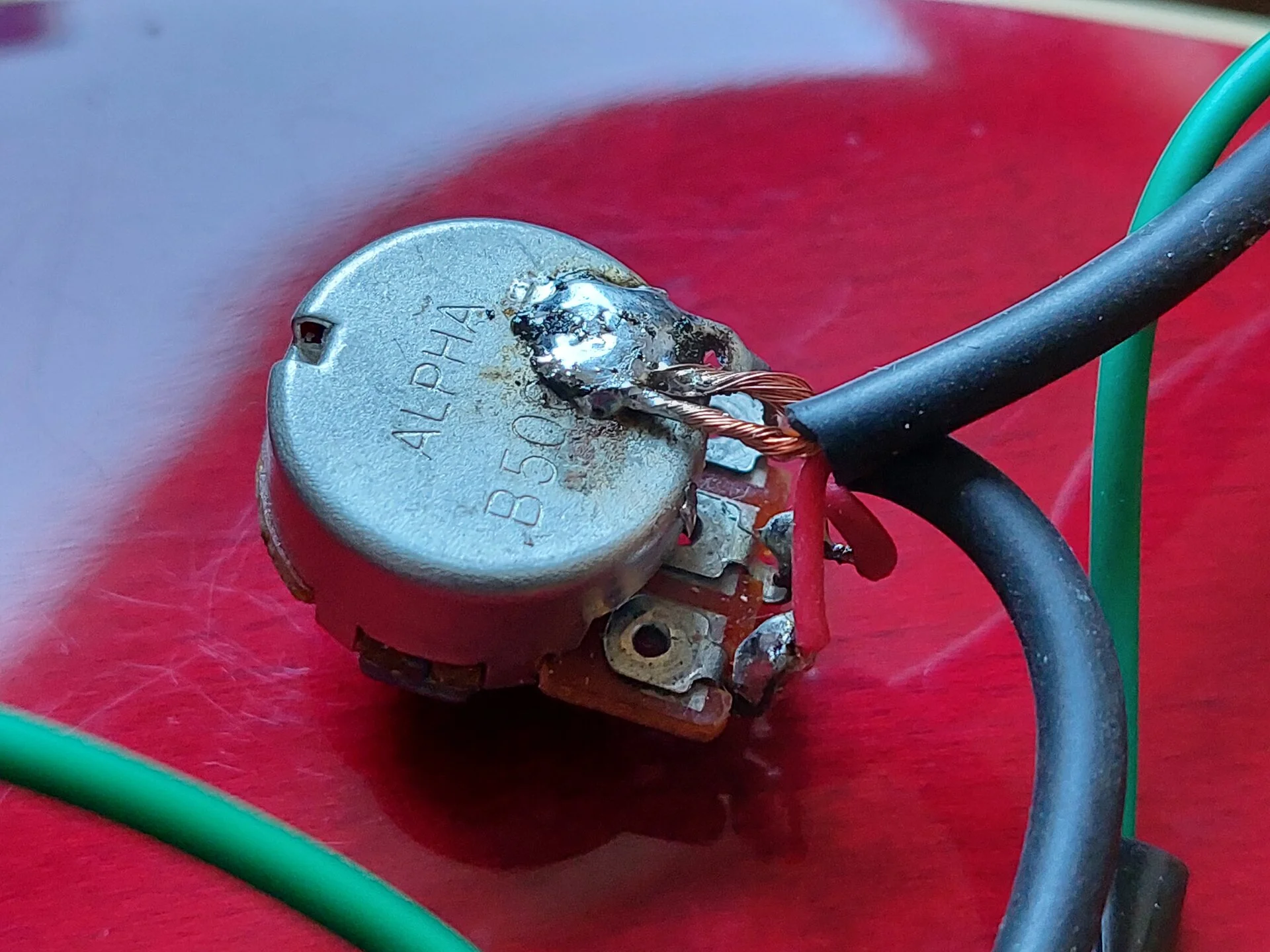 Ich persönlich bin ein Fan davon meine Steghumbucker nicht nur in der standardmäßigen seriellen Schaltung der Spulen zueinander spielen zu können, sondern auch in einer Parallel-Schaltung. Es klingt ähnlich wie eine einzelne Spule, hat aber den Vorteil des Humbucking-Effekts. Magnetische Einstreuungen werden unterdrückt, was bei einer einzelnen Spule natürlich nicht der Fall ist. Da der Seymour Duncan DC ein fünfpoliges Kabel hat und damit alle vier Wicklungsenden plus den Schirm bereitstellte, wäre er für diese Schaltungsvariante bereit und müsste nicht umgebaut werden wie der Bausatz-Humbucker von "Paulus" damals.Allerdings bräuchte ich natürlich dazu einen Schalter, oder ein Push/Pull, oder Push/Push-Poti.