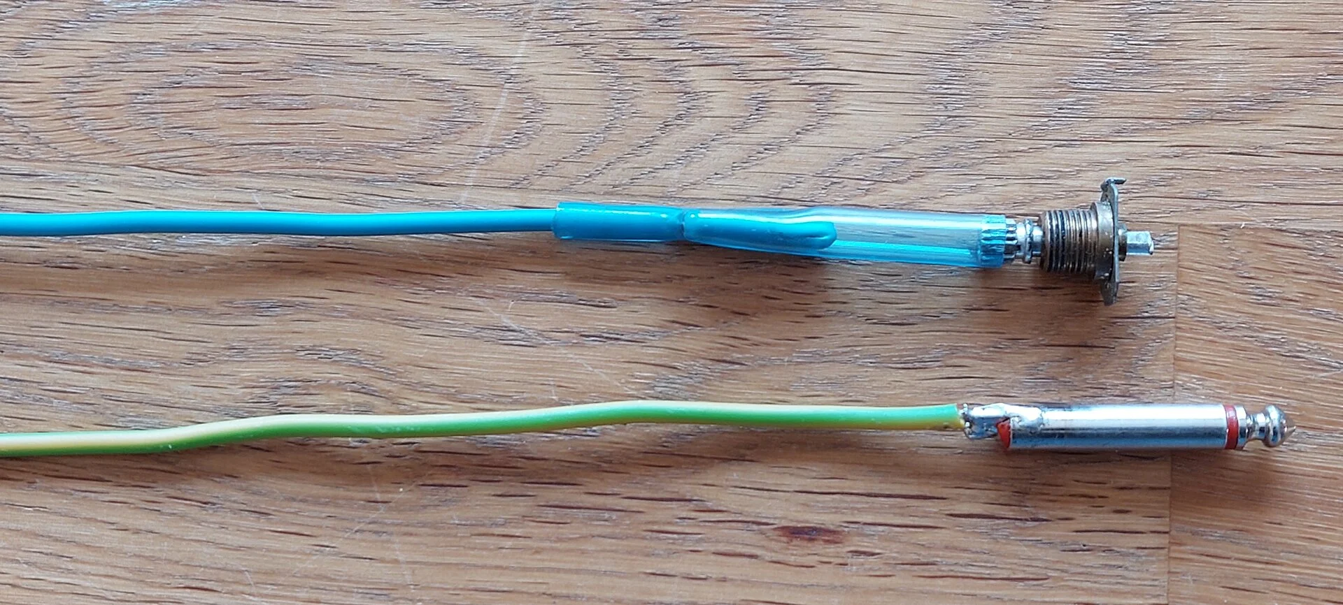 Der Einbau der gesamten Schaltung durch das F-Loch ist deutlich knifliger, als der Ausbau, da ja nun alle Potiachsen und die Buchse wieder in ihre Löcher eingefädelt werden müssen.Um das zu machen habe ich mir zwei einfache Hilsfwerkzeuge gebaut: Ein Schlauch, der auf das umgebogene Ende eines 2,5mm²-Massivdrahtes gesteckt wird und auf die Potiachsen gesteckt werden kann und der Rest eines 6,3mm-Klinken-Patch-Kabels, welcher nur noch aus dem Steckerteil besteht und an das Ende eines zweiten 2,5mm²-Massiv-Drahtes gelötet wird.