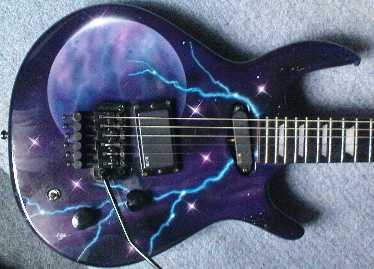 Das macht ein guter Airbrusher freihand auf einer Messevorführung innerhalb einer halben Stunde. Blitze, Wölkchen, Sterne etc. gehören zu den ersten Motiven, die man erlernt.