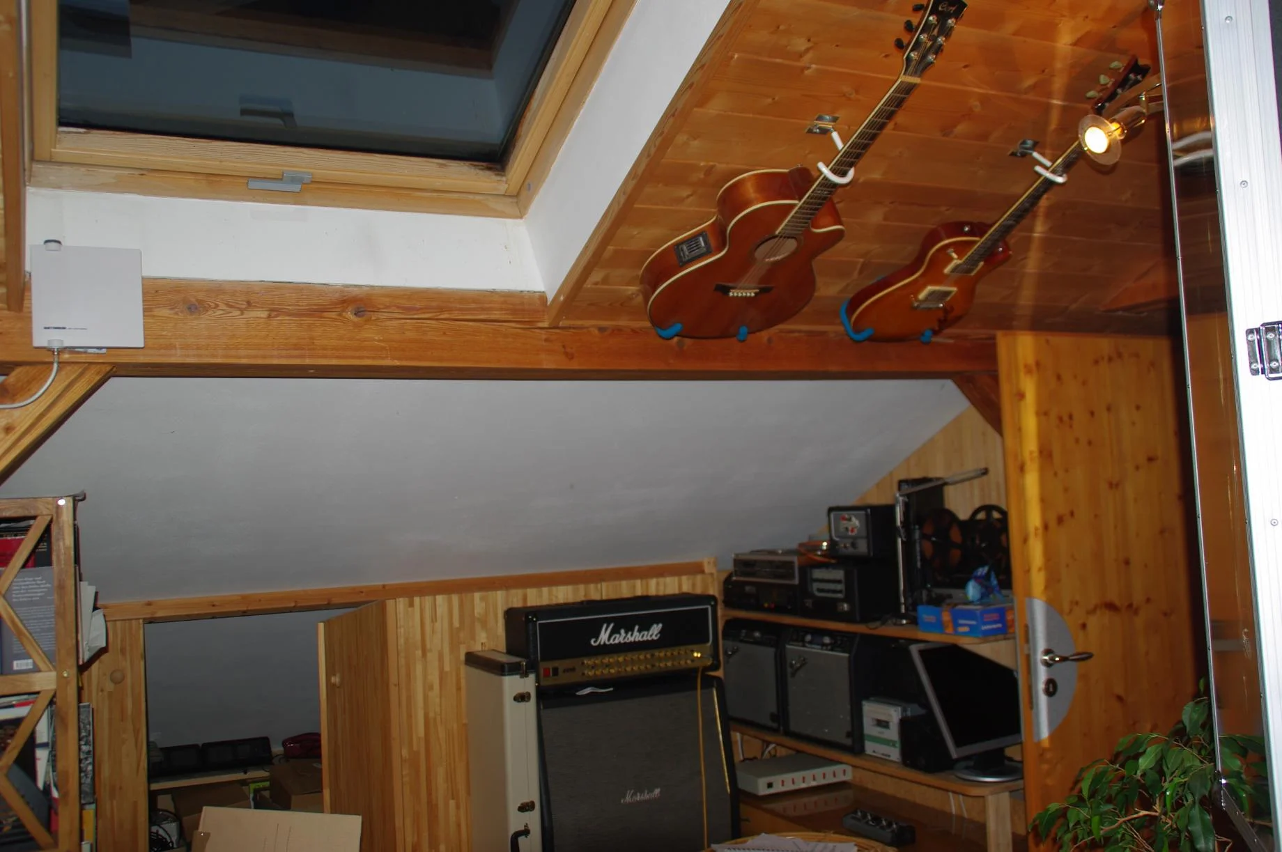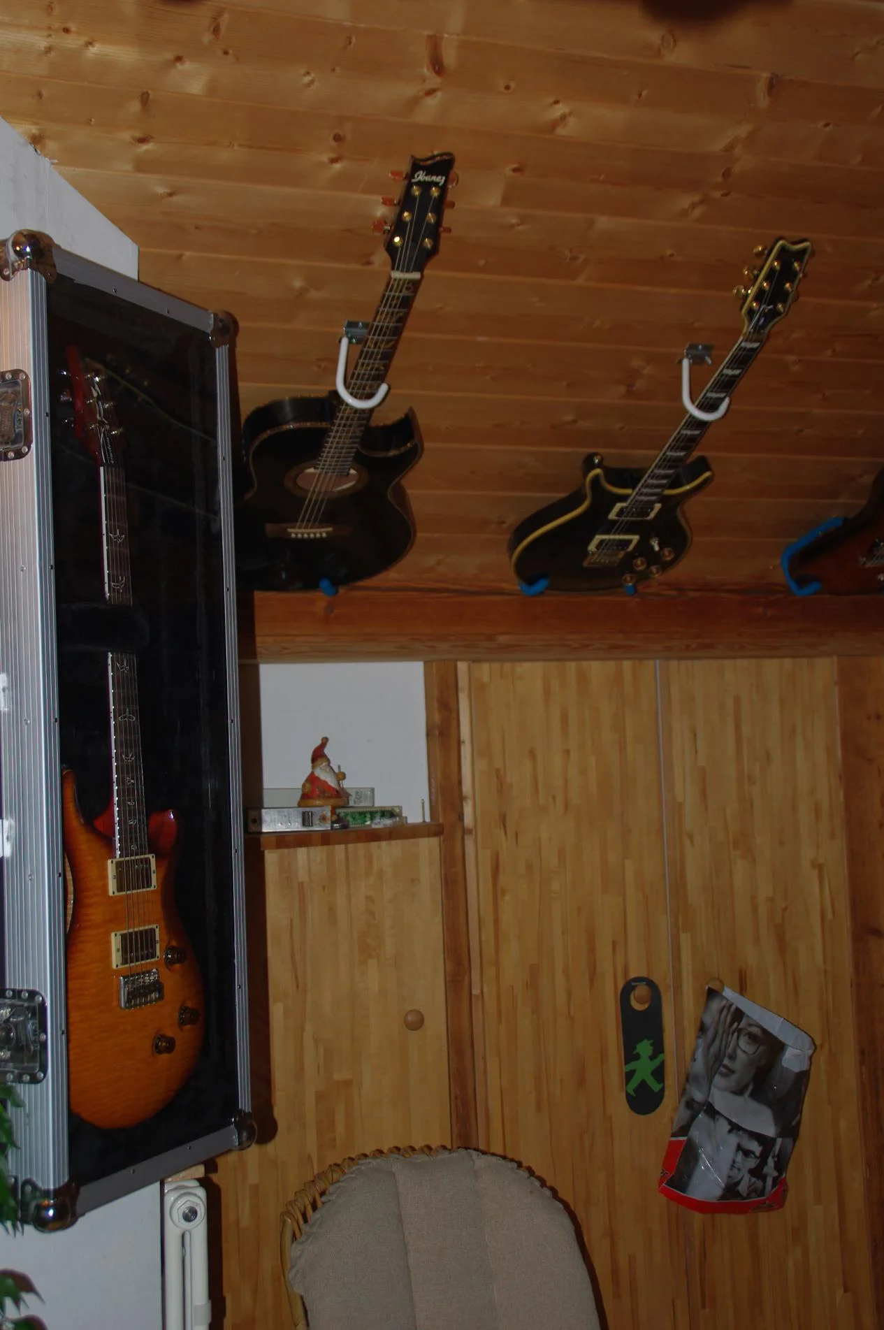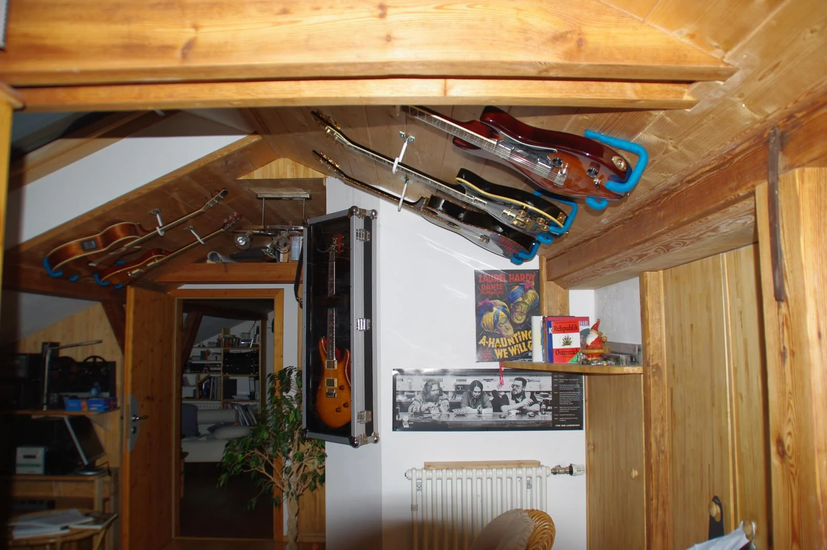 ), kommt wieder nach Hause und wundert sich, dass sich der übliche Gitarrenbestand in den verschiedenen Räumen dezimiert hat. Mein Herr Papa hat sich für seine Gitarren eine neue Aufbewahrungsmethode überlegt. Und zwar hängt bei uns im Speicher der Himmel jetzt voller Gitarren... 😉