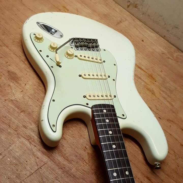 Leichter Erle-Body in OW lackiert (Nitro, schon etwas "vergilbt") mit leichtem aging. Leicht kräftigerer Hals (etwas mehr als ein normales Strat-C) mit Griffbrett aus dark indian rosewood (compound radius), Smitty Blues 64 PU's.