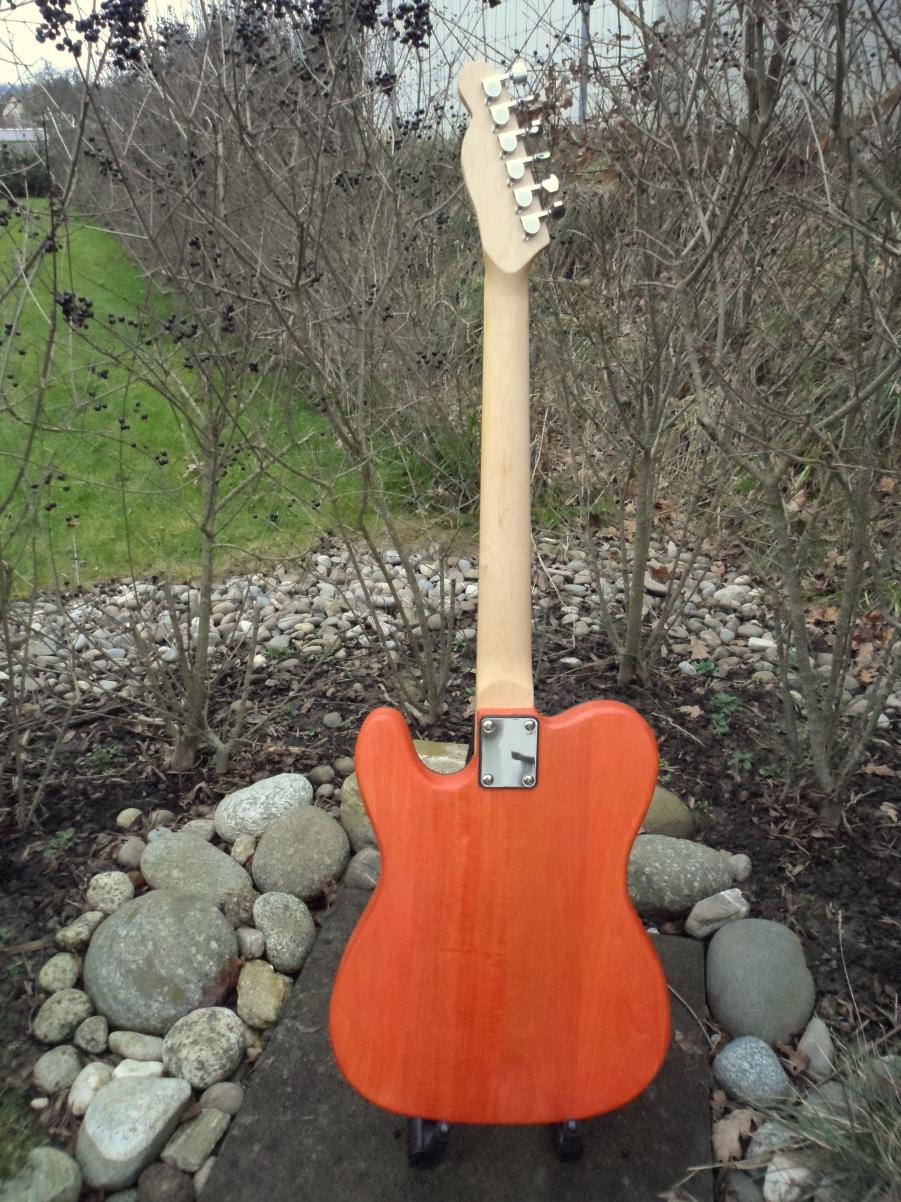 Also, erstmals danke für das Feedback. Den Headstock habe ich von einer Tele von F**D*R übernommen. Der Hals ist auch lackiert, aber mit einem eher farblosen Lack. Den Korpus habe ich nach meiner Idee :rolleyes: versucht zu lackieren. ChevChelios sah sie am 28. Dezember noch in Rot, hat mir aber nicht gefallen, deshalb wurde nochmals kräftig geschliffen. Nun gefällt es mir...einigermassen... Ist immer so, wenn eine Gitarre fertig ist, weiss man noch nicht so recht, soll man sie jetzt schön finden oder nicht?