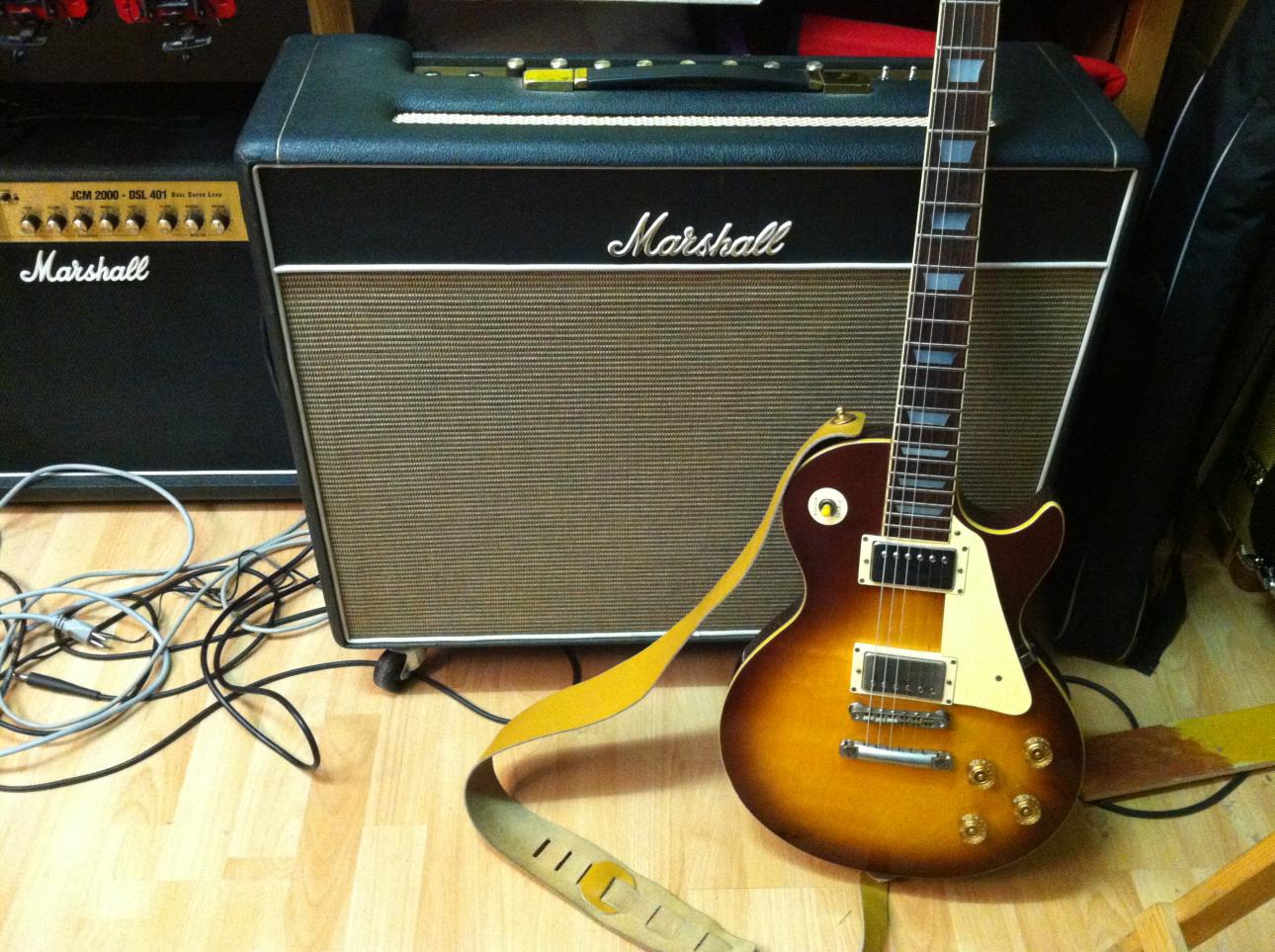 Anhang anzeigen 271748v. l. n. r. : Schreibtisch/Recording-Ecke. Unten drunter der Fender Blues DeVille, vielleicht oben noch auf den Tisch der kleine Champ 600. Dann folgend die Daltons.