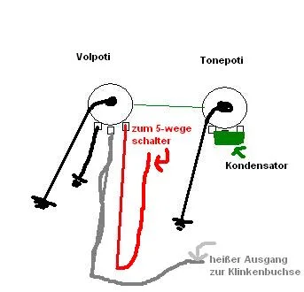 Sprich, du knickst die Kontakte der Potis, die dieses schwarzen Massepfeil haben um und lötest sie auf die Rückseite der Potis. Daran lötest du dann alles andere, was diesen schwarzen Massepfeil auf der Skizze hat.
