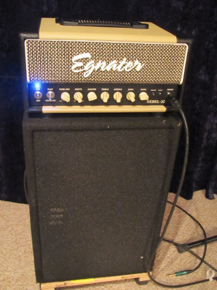 Ich bin recht zufrieden damit. Klingt wegen der Bassreflexöffnungen größer, als er eigentlich ist. Der Speaker ist ein Rola Celestion von 1976, den ich mal geflickt habe und der mit 20 Watt angegeben ist - für meinen kleinen Rebel, den ich seit neustem besitze, ein schöner Begleiter in meinem Musikkeller.