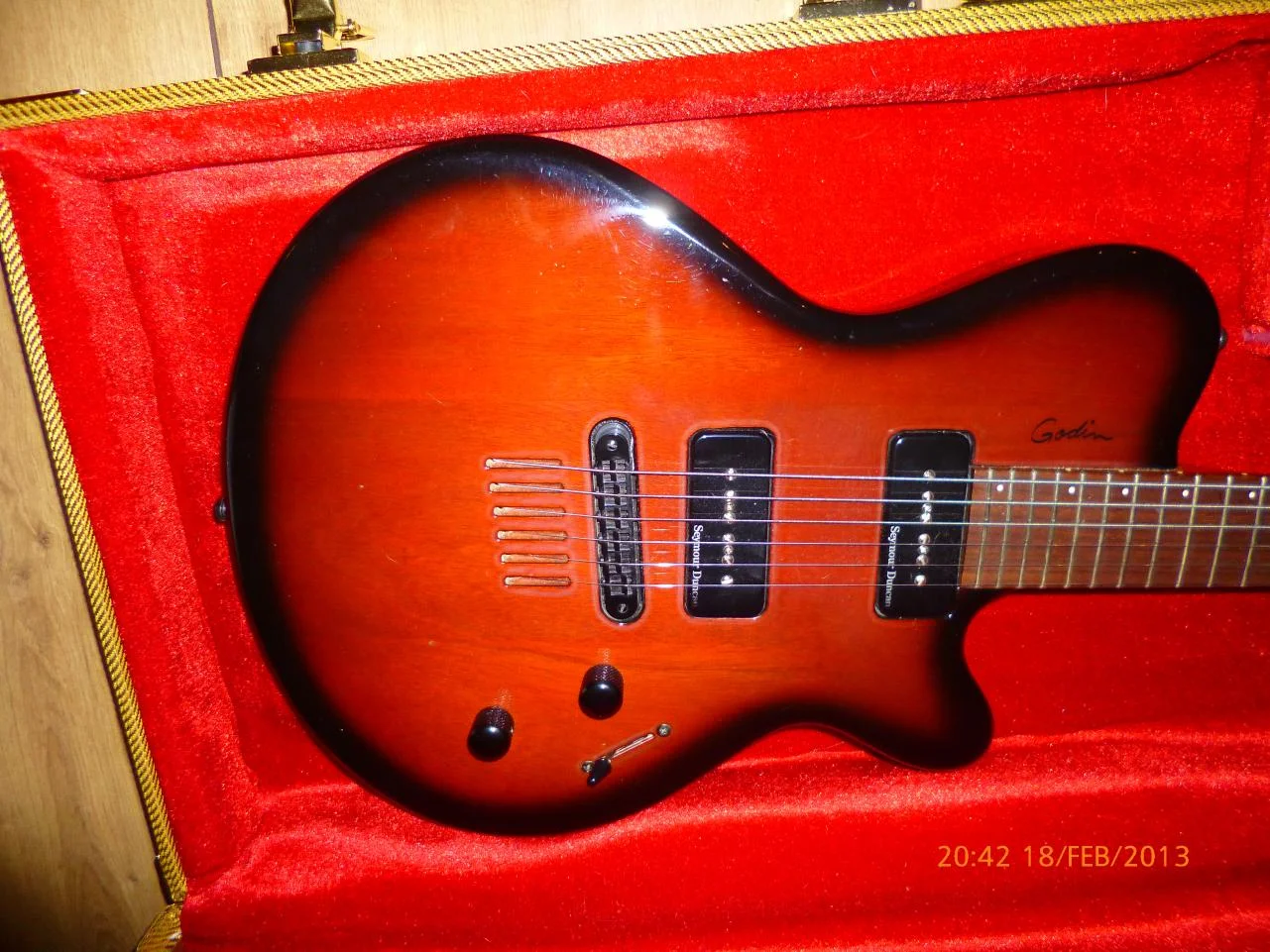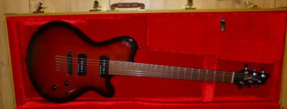 ...Um es mal zu vergleichen. Klingen meine anderen Gitarren namhafter Hersteller richtig gut wie ein sauber eingestellter 4 Zylinder Motor, antwortet die Godin mit ihren P90 Abnehmern luftgekühlter V2 Motor.