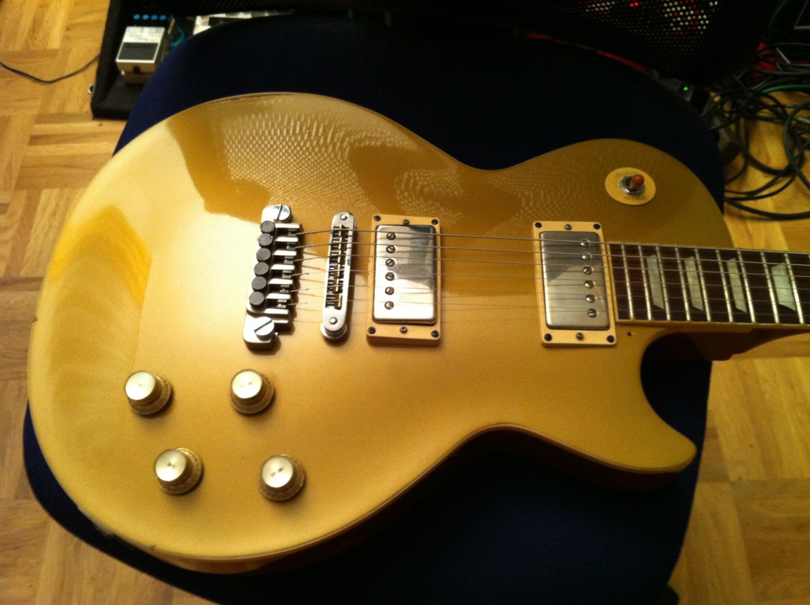 Der 60er Jahre G- Schriftzug ist übrigens aus Briefpapier ausgeschnitten und mit 2 verschiedenen Perlmutt- Nagellacken gefärbt, der Les Paul Schriftzug ist aus Letraset Buchstaben aufgerubbelt und