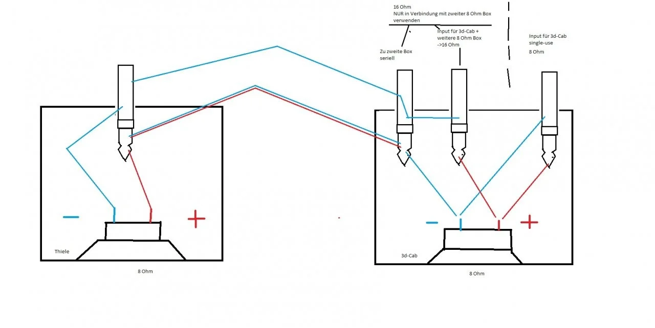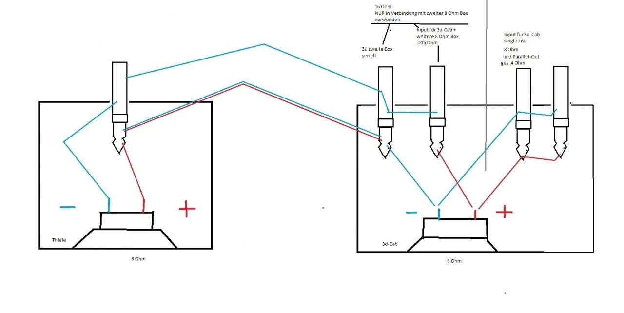 Dazu kommen dann die 2 anderen Buchsen. Buchse 1 wird der Input für den Amp. Der Spitzen-Kontakt geht an Plus des Lautsprecher. Vom Minus des Lautsprechers geh ich an die Spitze von Buchse 2. (die zur zweiten Box geht). Verbinde ich Buchse 2 nun mit der Thiele-Box, ist dann das Minus des 3d-Cabs mit dem Plus der Thiele verbunden, da der Spitze-Kontakt der Thiele zum Plus des Speakers führt. Das Minus des Thiele-Speakers nun am Schaftkontakt. Dann verbinde ich die beiden Schaftkontakte von Buchse 1 und 2 in dem 3d-Cab. Somit habe ich doch eigentlich die Reihenschaltung, oder?
