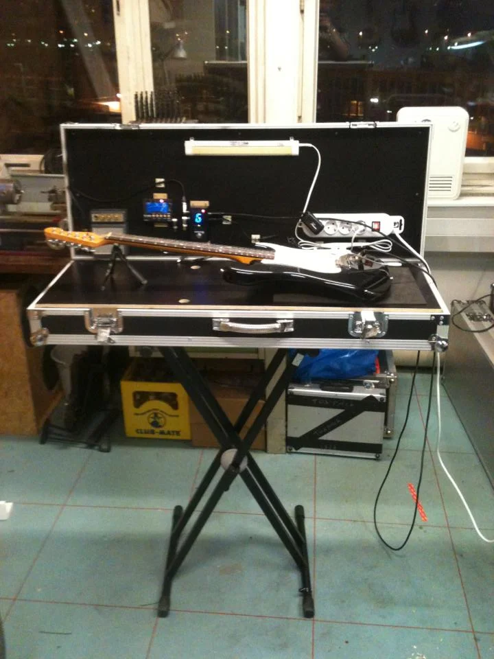 In unserer werkstattorientierten Firma gibt es für das Handling mit Instrumenten sehr enge Richtlinien, gegen die so ein Case in viellerlei Hinsicht verstößt. Ein Instrument muss bei uns vollkommen aufliegen können (also Tisch mind. so lang wie das Instrument) und über die Arbeitsfläche dürfen keine Kanten hinaus stehen. Darüber hinaus muss ein mobiles System "Sprintertauglich" sein. Deshalb musste eine andere Lösung her. In Zusammenarbeit mit anderen Profi-Backliner war dann die Idee einer Kofferwerkbank gebohren.... aber woher nehmen, wenn nicht bauen lassen.