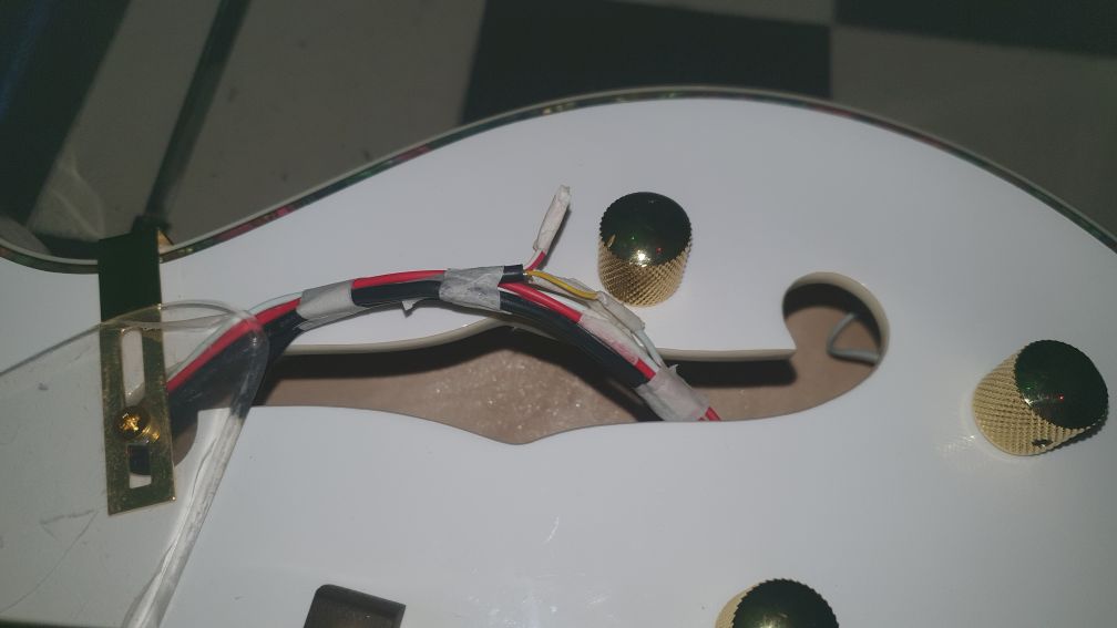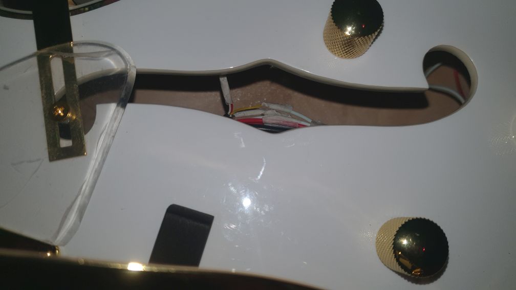 Beim Blick in das untere F-Loch zeigt sich, dass die Kabel mit Klebeband (Maler-Krepp???) zusammengehalten werden. Es scheint sogar, dass dort Kabelenden verbunden wurden und mit Klebeband isoliert wurden (hoffentlich nicht nur verdrillt, sondern wenigstens verlötet).