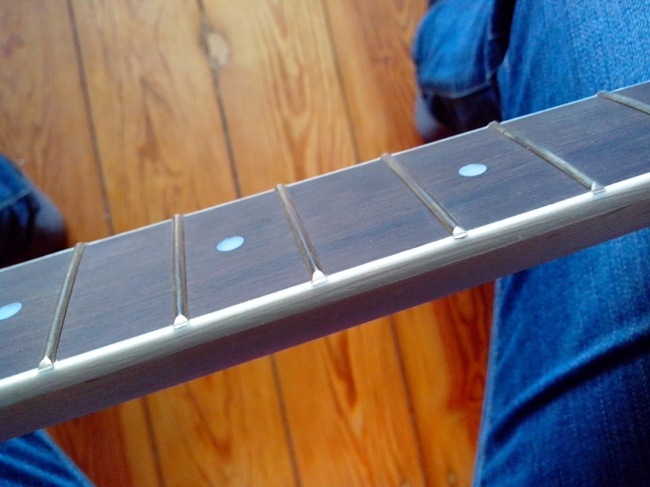 Bisher hatte ich gedacht entweder das Binding abzukleben (risky, da schmal) oder mit einer Ziehklinge freizukratzen. Dann Klarlack für den ganzen Hals auftragen und letztendlich mit feiner Stahlwolle mattieren und Bundstäbchen freimachen.