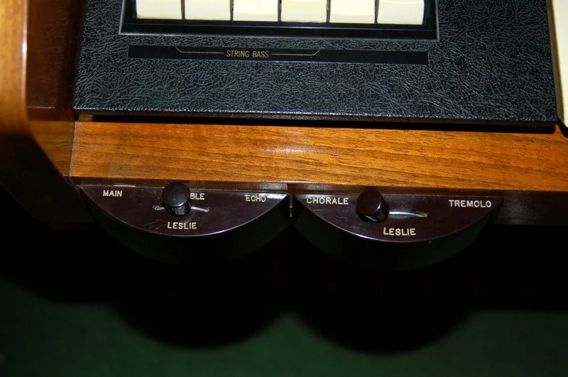 Einen Anschluß für ein externes Leslie hat die T200 nicht. Die TTR 100 Modelle hatten einen Preamp II eingebaut, der den Anschluss eines Leslies mit 9-Pol System ermöglicht.