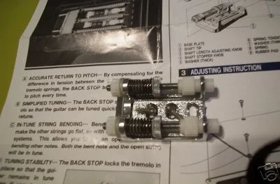 Ich hab mein System allerdings so fest eingestellt, daß so gut wie keine Tremolo-Bewegungen mehr gemacht werden können. Bei meiner alten 74er Strat hatte ich den Block einfach mit Holz fixiert (ala Clapton), diesmal halt den feineren Weg ...