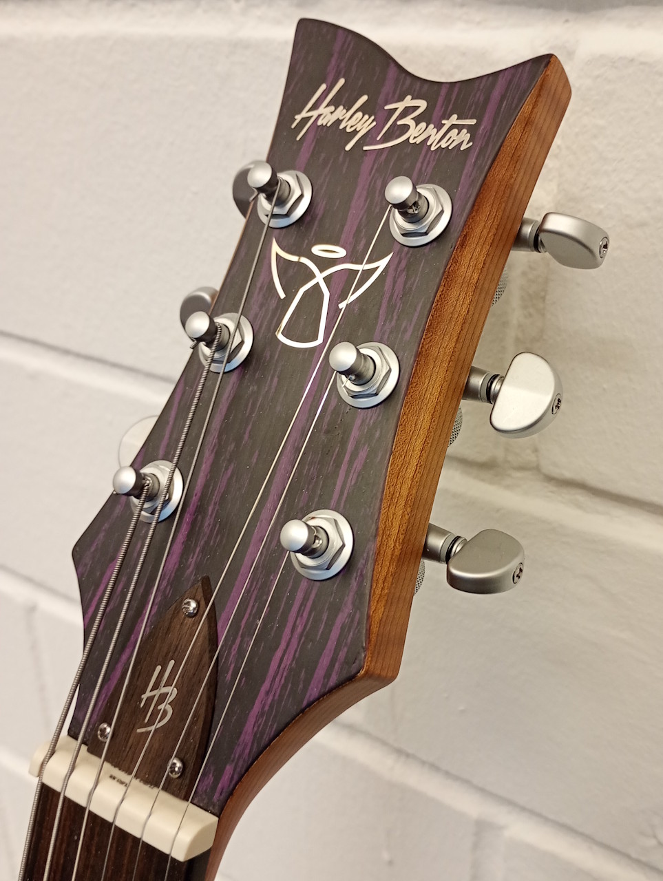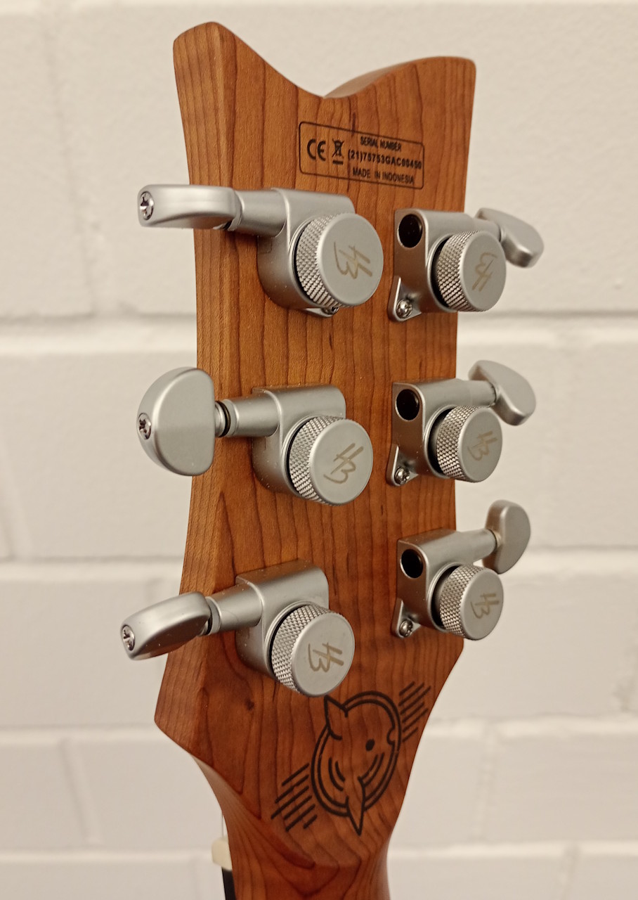 Das Roasted Maple Finish des Halses ist haptisch top. Es fühlt sich trocken und schnell an, nie klebrig. Die Edelstahlbünde sind ein Feature, das ich bei der Baritone doppelt schätze, da der Druck auf die Saiten bei meiner „Betriebsweise“ tendenziell eher etwas höher ist. Herkömmliche Bünde würden vermutlich deutlich schneller verschleißen.