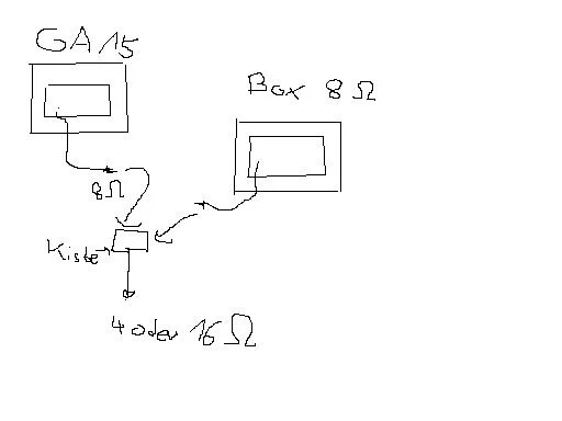 Im Bandraum möchte ich gerne den Combospeaker und die Zusatzbox benutzen. Gibt es sowas, was in der Grafik mit "Kiste" beschrieben ist, wo ich beide 8 Ohm Boxen anschließe und am Ende dann ein Kabel mit 4 oder 16 Ohm (parallel oder seriell ist dann ja egal, da der GA15 beides hat) hat?? Quasi eine Verschaltungskiste mit 2 Klinkeneingängen und nem Klingenkabel als Ausgang, welche also die 2 Speaker parallel oder seriel verschaltet.
