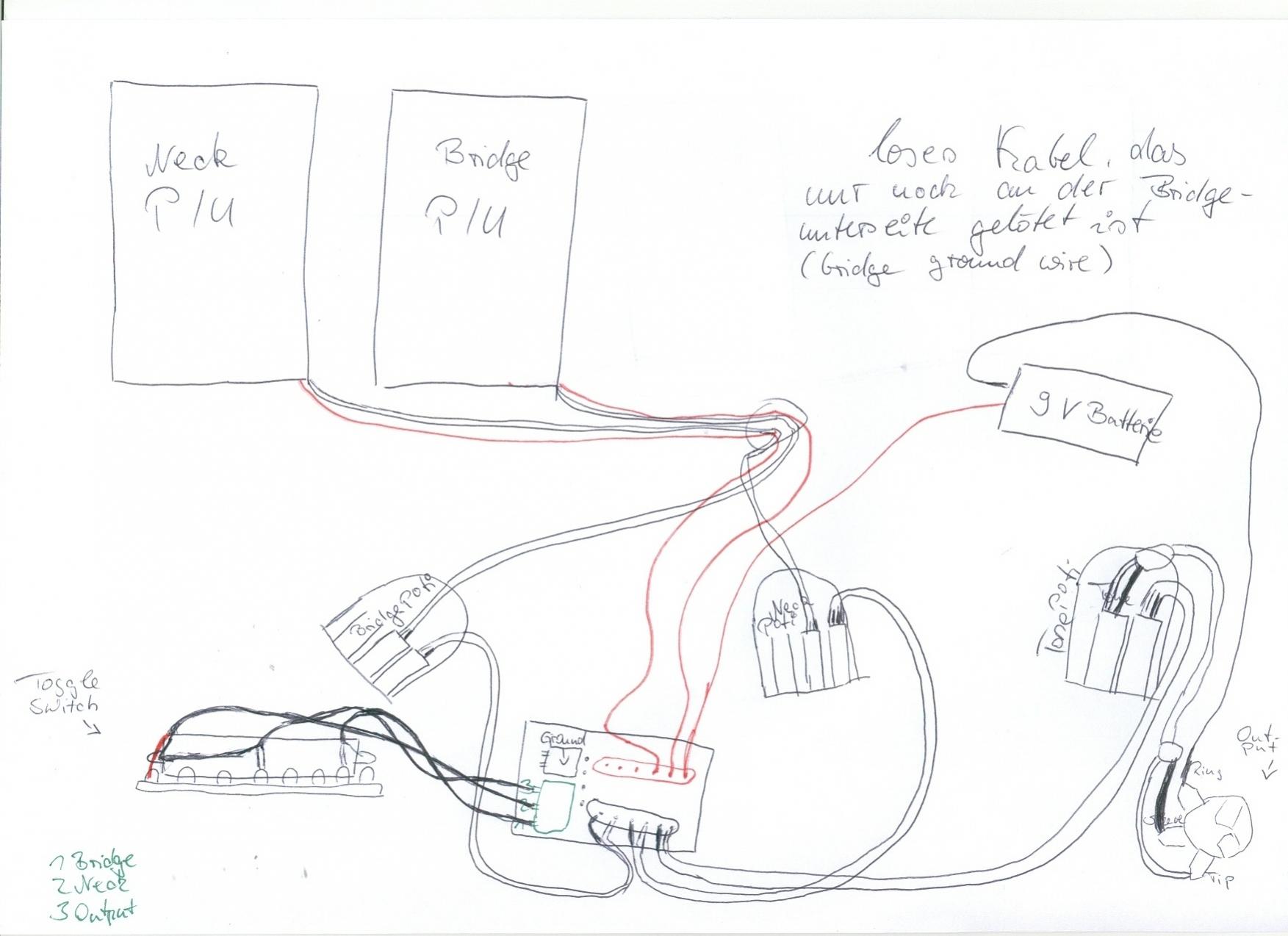 . Gott sei Dank war Hillfe dann auch ein paar Tage später zur Hand, und mein Vater hat die Dinger wieder angelötet und zwar an Ort und Stelle, denn glücklicherweise habe ich mir vorher einen Schaltplan von dem ursprünglichen Zustand gemacht. Zwischendurch habe ich aber alle anderen Anweisungen in der Anleitung befolgt wie sie drin standen. Nun ist es aber so, dass ich mit dem Ergebnis nicht zufrieden bin. Irgendwas ist da gehörig schief gelaufen. Der Sound, den meine ESP nun von sich gibt, ist schlechter als vorher. Ich hab ja als Amp einen Marshall MG 100DFX und habe den immer auf Overdrive Stufe 2 gestellt. Ich habe spaßeshalber mal auf Stufe 1 gestellt und musste feststellen, dass da aber schon rein gar nichts mehr Overdrive war, noch nicht mal Crunch, also alles andere als Metalsound, was ich ja eigentlich erwartet hätte. Der Sound ist zudem auch noch bei allen 3 Toggleswitchstellungen gleich und das verwundert mich dann noch mehr. Aber es geht noch weiter. Die beiden Volumeregler, die ja normalerweise jeweils einem Pickup zugeordnet sind, regeln jetzt anscheinend beide, nur jeder halt bloß die Hälfte von der Lautstärke... Der Regler für die Klangfarbe tut allerdings überhaupt nichts, da kann man drehen wie man will. Das einzig positive ist, das ich kein Netzbrummen mehr höre, sobald ich die Saiten loslasse.