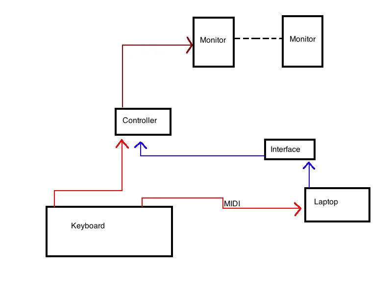 Wie schließe ich das alles (Monitore, Keyboard, Interface) am sinnvollsten an, um sowohl "abgekoppelt" vom MacBook spielen zu können, aber auch Aufnahmen über den Mac über die Monitore abhören zu können?