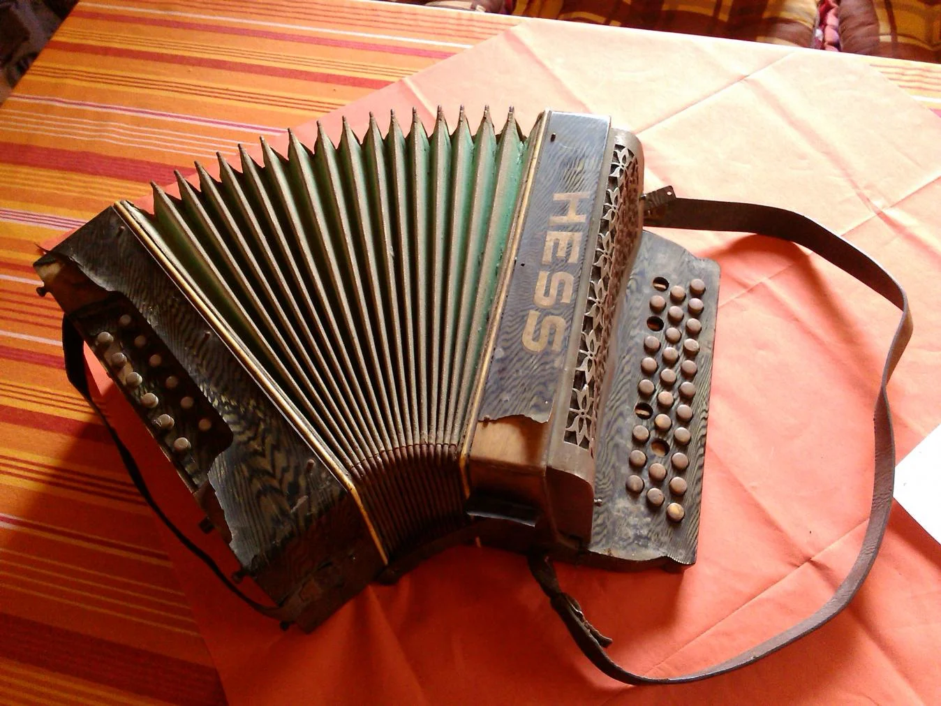 Hallo,wir haben ein Altes Akkordeon von Hess auf dem Speicher gefunden, dieses ist in einem sehr schlechten Zustand, aber wir würden gern wissen was für ein Akkordeon es ist und wie alt es ist. Vermutungen sagen das es mehr als 60-70 Jahre alt sein müsste, vielleicht habt ihr da ja mehr Ahnung.🙂
