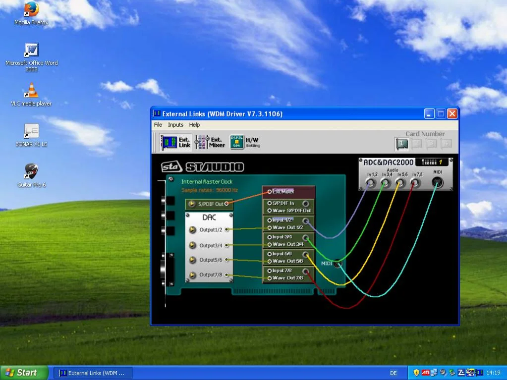 ich habe da folgendes Problem: ich habe mir das Hoontech ST Audio DSP2000 C-Port ersteigert. Habe dafür unseren Proberaum PC in Benutzung (mit Windows XP). Das Interface habe ich super zum Laufen bekommen. Allerdings bekomme ich im Cakewalk Sonar X1 LE kein Signal. Bei irgendeiner Einstellung stürzt der Rechner immer ab.