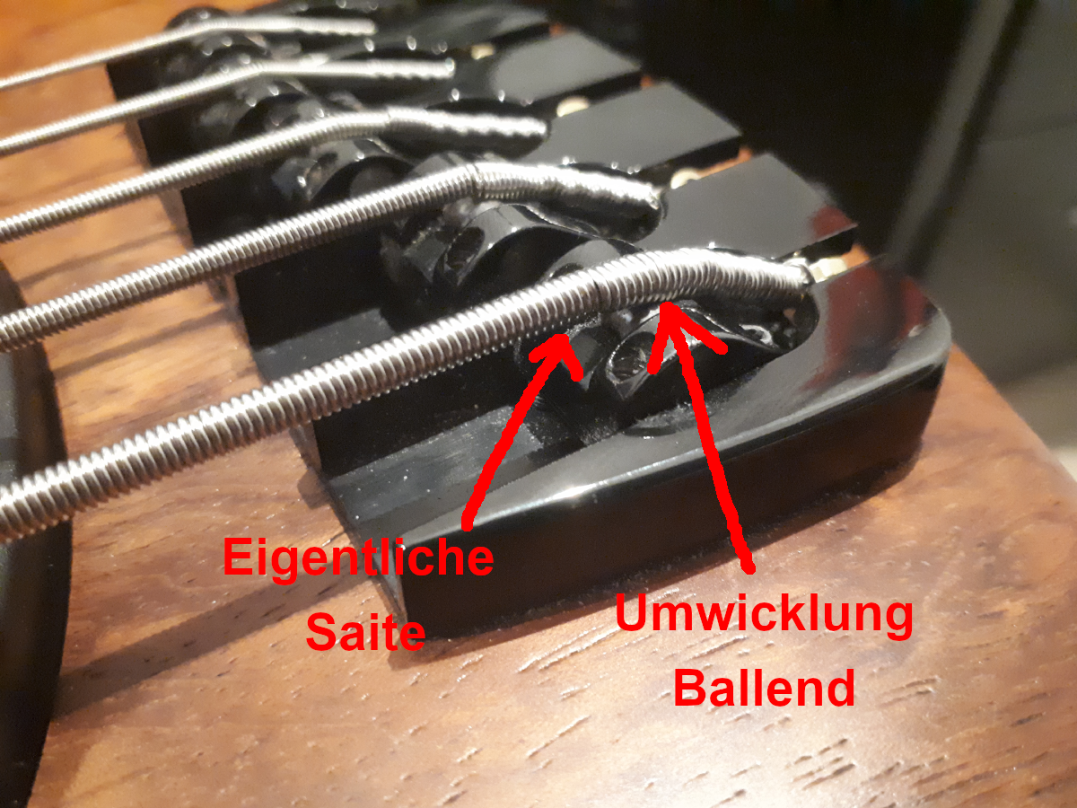 Am Ende der Saite ist das Ballend, dieses ist Umwickelt und dicker als die eigentliche Saite. Bei meinem Bass liegt diese Umwicklung statt der Eigentlichen Saite auf dem Reiter auf.