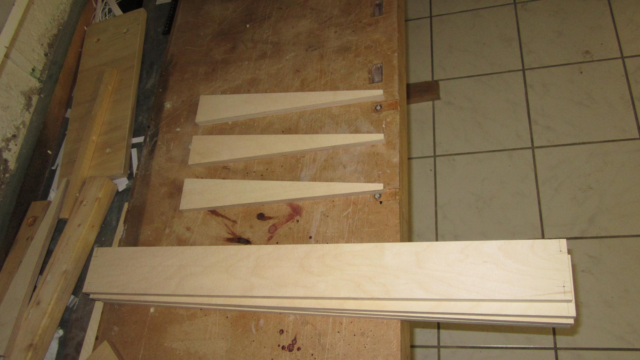 Zunächst sägt man aus den zwei kleinen Multiplexleisten trapezförmige Stücke zu, diese dienen am Ende als Träger für die Querplanken. Normalerweise würde man dies besser von Profi machen lassen, leider sind die Abmaße aber zu klein um es im Baumarkt sägen zu lassen. Am besten mal fragen, bei mir wurde es jedoch abgelehnt.