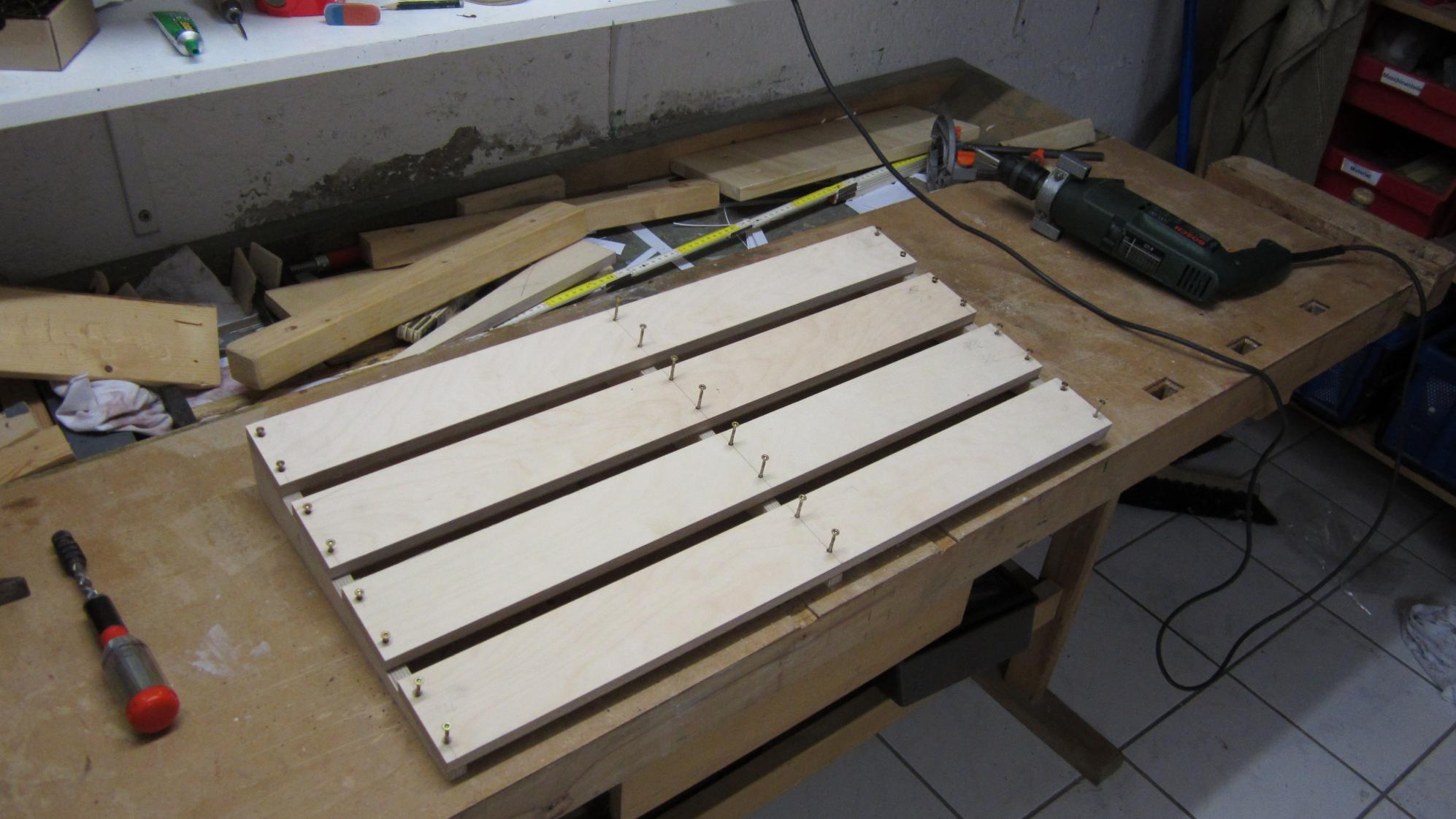 Jetzt kann man mit dem Zusammebau beginnen. Stabil wird das ganze wenn man pro Verbindungsstelle zwei Schrauben verwendet, dabei muss man allerdings sehr genau arbeiten damit dass Board sich nicht verzieht und wackelt.