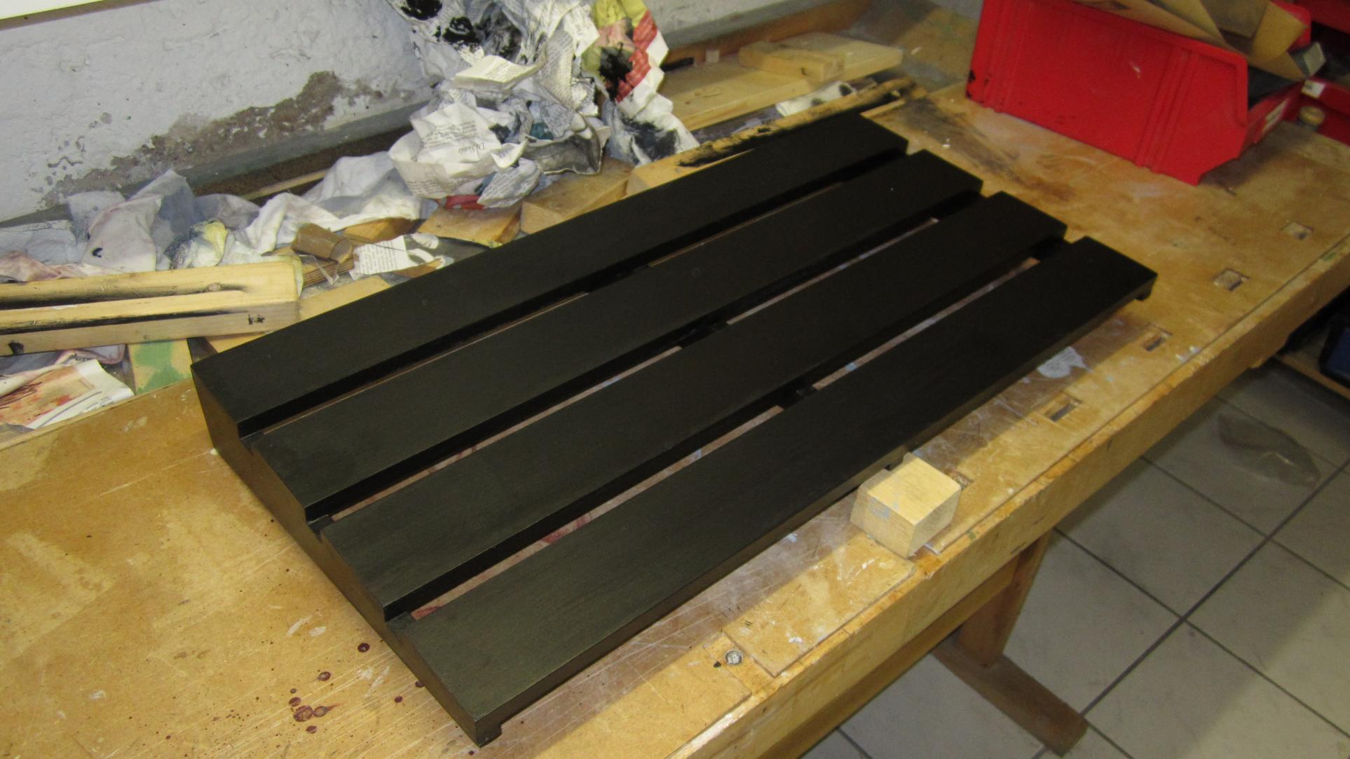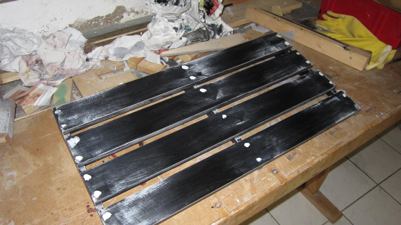 Nun werden noch die Schraubenköpfe, die man vorher komplett in die Leisten reingeschraubt haben sollte (eventuell nochmal mit der Fräse die Löcher senken) mit Spachtel abgedeckt und dieser anschließend bündig abgeschliffen. Danach wird die Vorsteichfarbe und anschließend die Endfarbe draufgepackt (bei mir Schwarz).