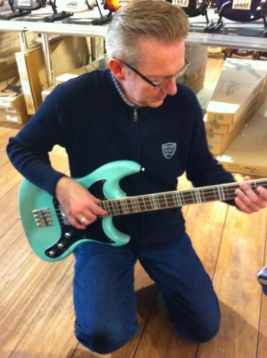 Dann seid Ihr schon auf dem Weg nach draußen, nehmt aus Spaß, lachend einen kleinen Shortscale Bass in die Hand, der wegen seiner auffälligen Farbe aus dem Einheitsbrei von schwarz und weiß hervor leuchtet. Eigentlich nur um damit ein Joke - Foto zu machen.