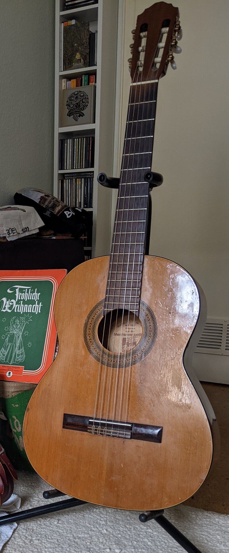 ...in diesem Thema soll es um die Höfner Konzertgitarre gehen, die ich ende der 1980 er Jahre direkt im Werk in Bubenreuth gekauft habe (als B-Ware für 350,- DM) btw. die Auswahl war gigantisch, der Himmel hing voller Gitarren...