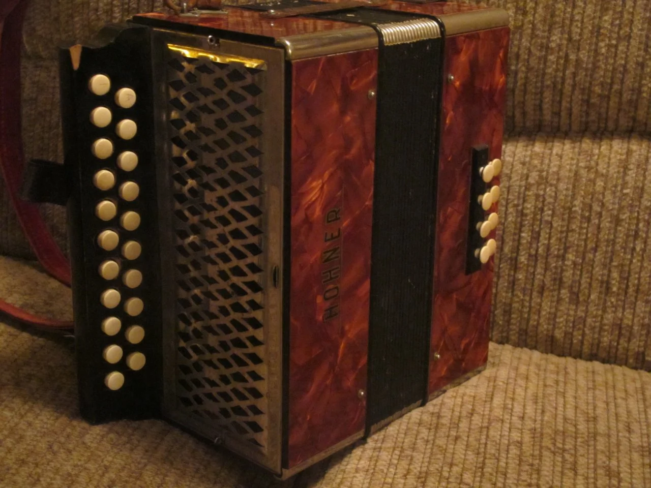 ein zweireihiges Hohner Knopfakkordeon (Erica-ähnlich, es steht nur Hohner drauf), das C/F gestimmt ist,