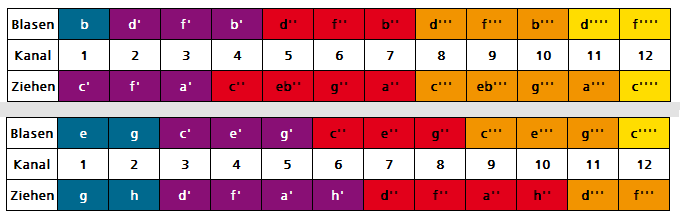 In den Ziehkanzellen liegen Sexte und Septime der Dur-Tonleiter nebeneinander. Das ist bei mehreren Stimmsystemen der Fall. Stört eine der beiden Stufen beim zweistimmigen Spiel, hat man zwei Möglichkeiten. Entweder man verschließt die Kanzelle des störenden Tones mit Zungenblock und kombiniert auf diese Weise die rechts und links davon angeordneten Töne oder schaltet in diesem Moment auf Einzeltonspiel um. Auf der Comet und der Kreuzwender bevorzuge ich das Umschalten auf Einzeltonspiel. Auf der