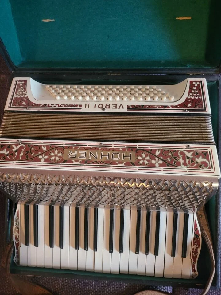 Ich habe von meinen Eltern eine ziemlich alte Hohner Vivaldi II geschenkt bekommen. Sie ist wunderschön, allerdings eine etwas ältere Dame, die schon einiges durchgemacht hat. Die Verzierungen sind zum Teil abgerieben, der Lack ist stellenweise abgeblättert, die Tragriemen fallen auseinander, etc. Tönen tut sie noch gut.