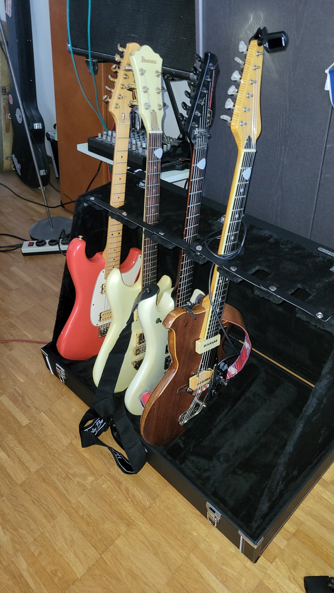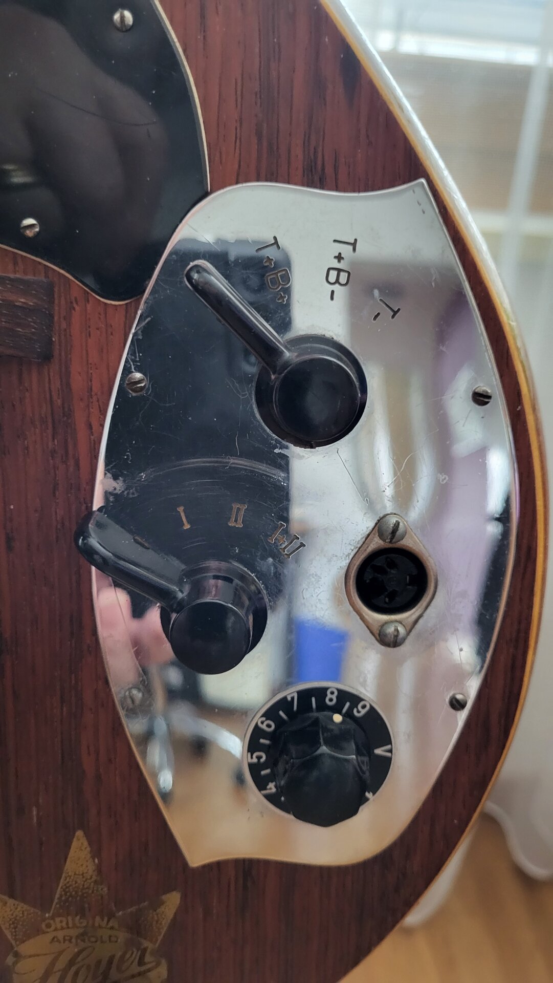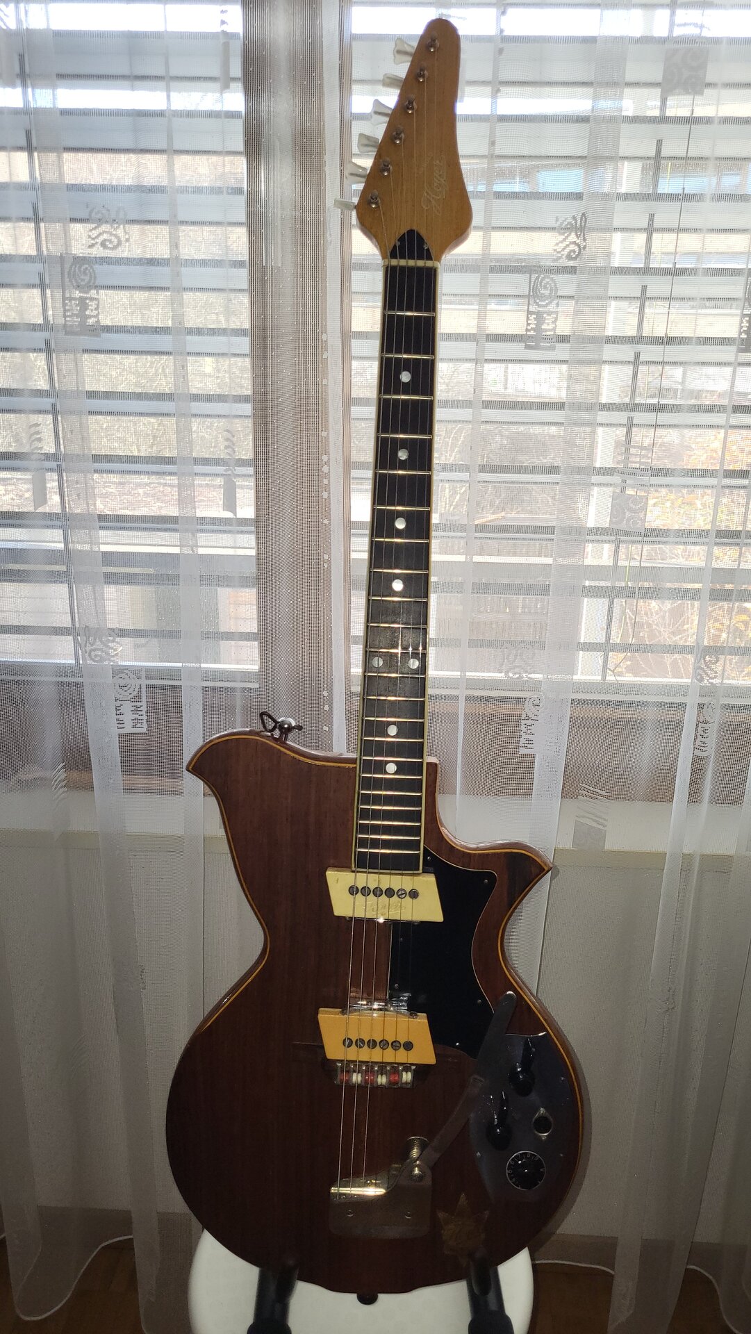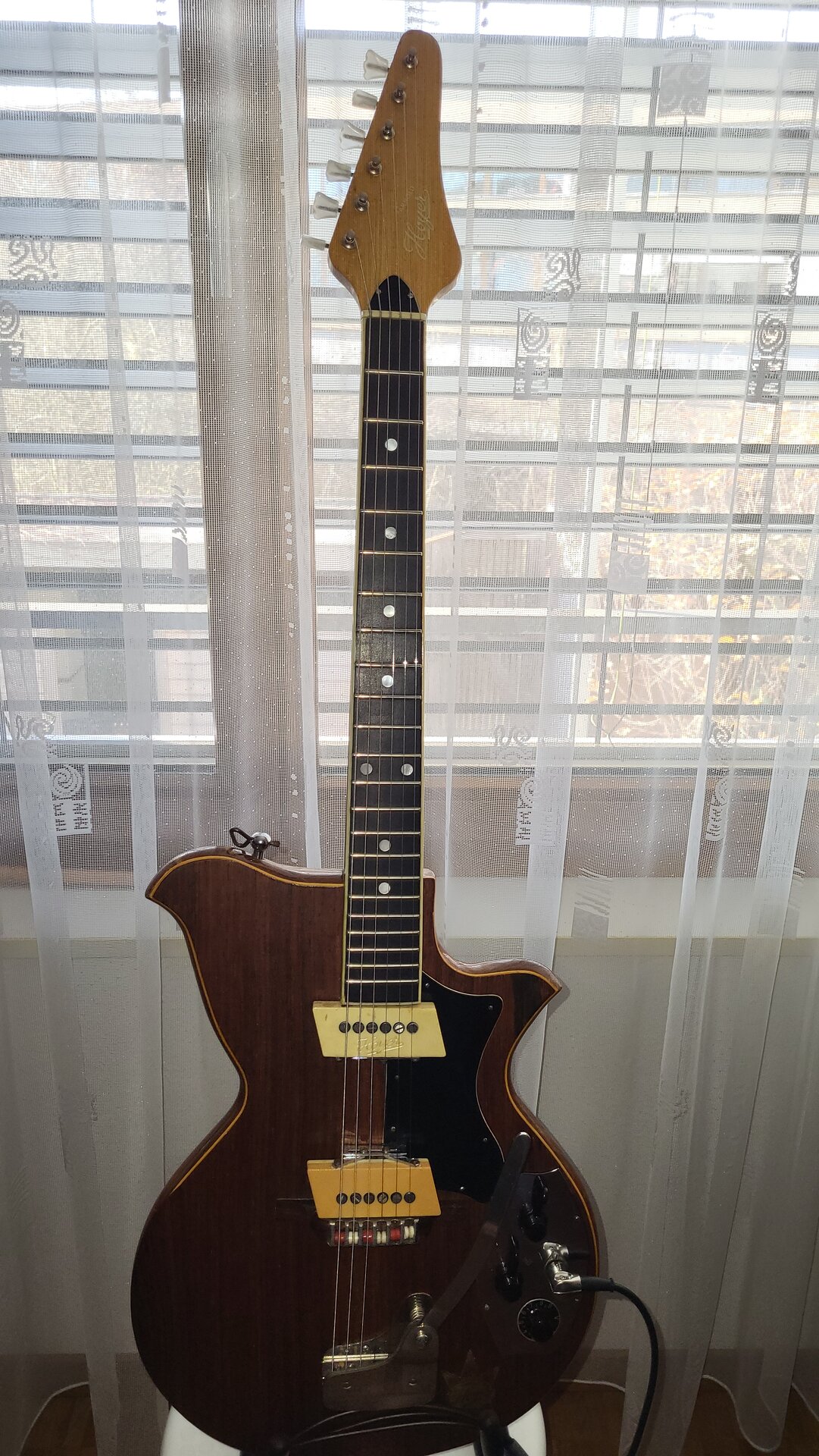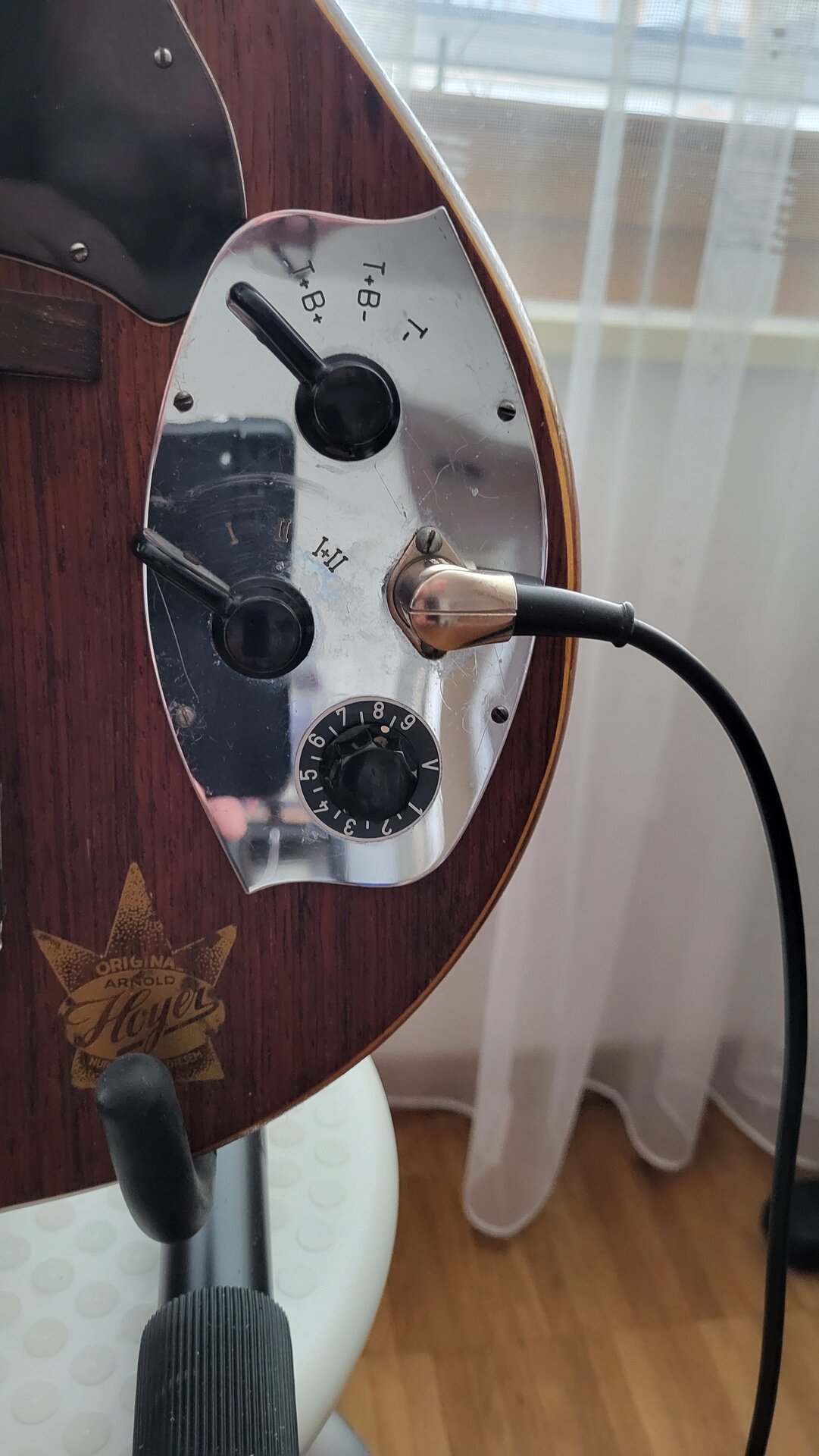 Bezugnehmend auf meine Posts 286 und 291 über meine Hoyer Modell 29. Sie war längere Zeit beim Gitarrenbauer um restauriert zu werden. Die erste Befürchtung von ihm war, dass eventuell die Pickups defekt wären. Zum Glück funktionieren beide noch und es mussten nur neue Kabel verlötet werden. Hals und Bünde waren auch noch tip top und benötigten keine grossen Arbeiten. Der von mir abgeschliffene vordere Gitarrenkörper (hellblaue Lackierung des Vorbesitzers) wurde auf meinen Wunsch hin nur geölt und nicht mehr lackiert. Mir gefällt dieses Finisch besser als die lackierte Rückseite. Das Resultat der Restauration gefällt mir sehr gut.