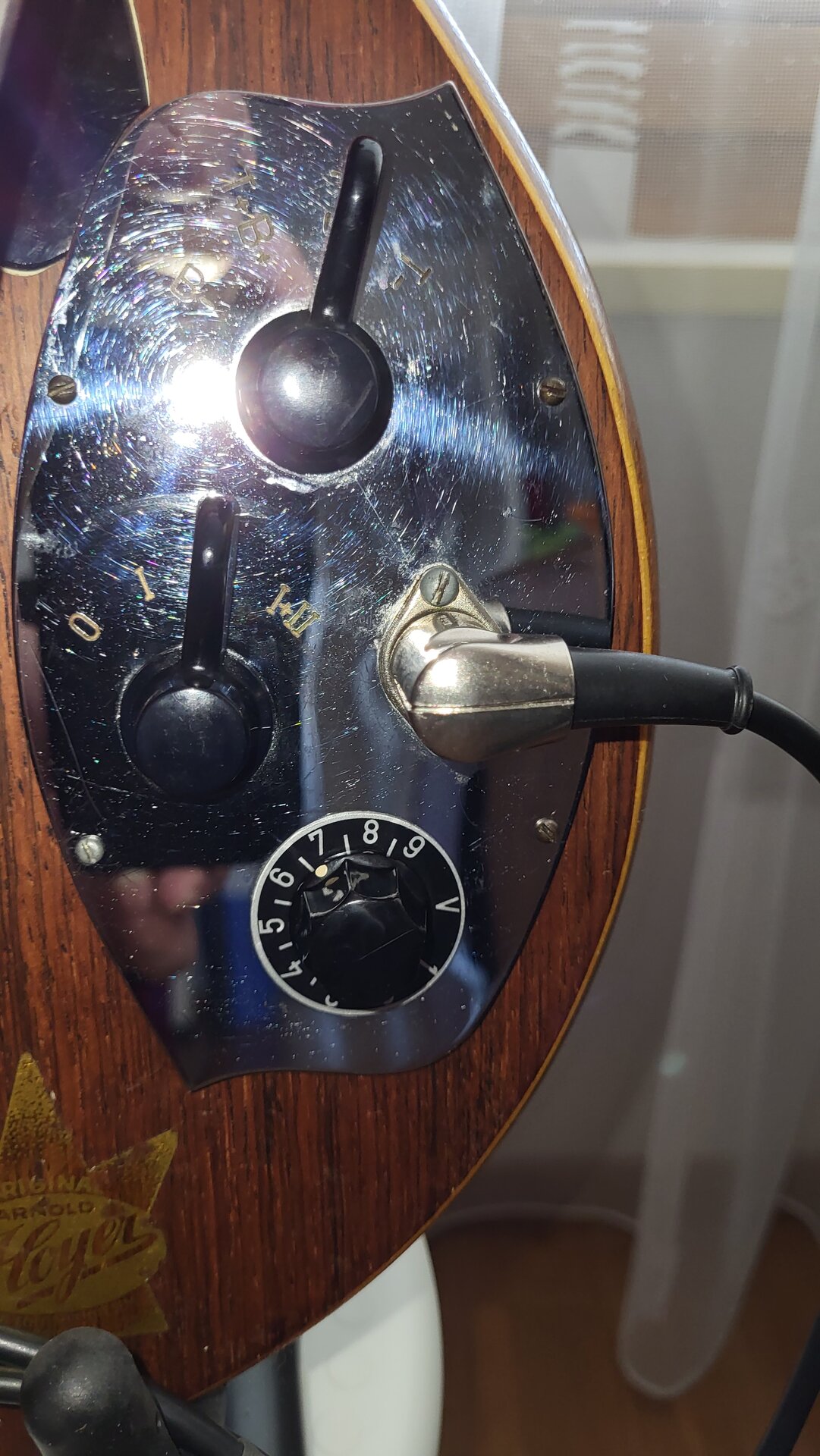 Speziell für heute ist der Anschluss der Gitarre über Cinch Stecker. Das Kabel ist natürlich auch sehr alt und im Handel so nicht mehr erhältlich. Das Kabel ist mittlerweile auch nicht mehr sehr flexibel, so dass ich mich früher oder später mit dem löten einer neuen Verbindung befassen muss. Aus verschiedenen Gründen kommt ein Umstieg auf Klinke nicht in Frage, da der Body auch zu wenig tief ist. Ich weiss auch, dass der Vorbesitzer damit schon Probleme hatte und der Anschluss an der Gitarre ersetzt werden musste.