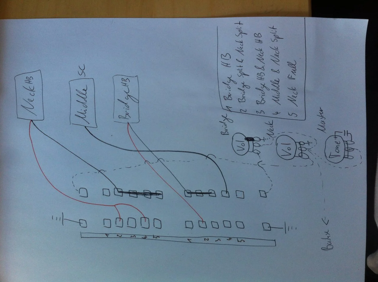 Potis sind alles 250k und die Tonabnehmer ein JB jr. , Fender Neck(!) SC, SD Lil 59 am Neck.