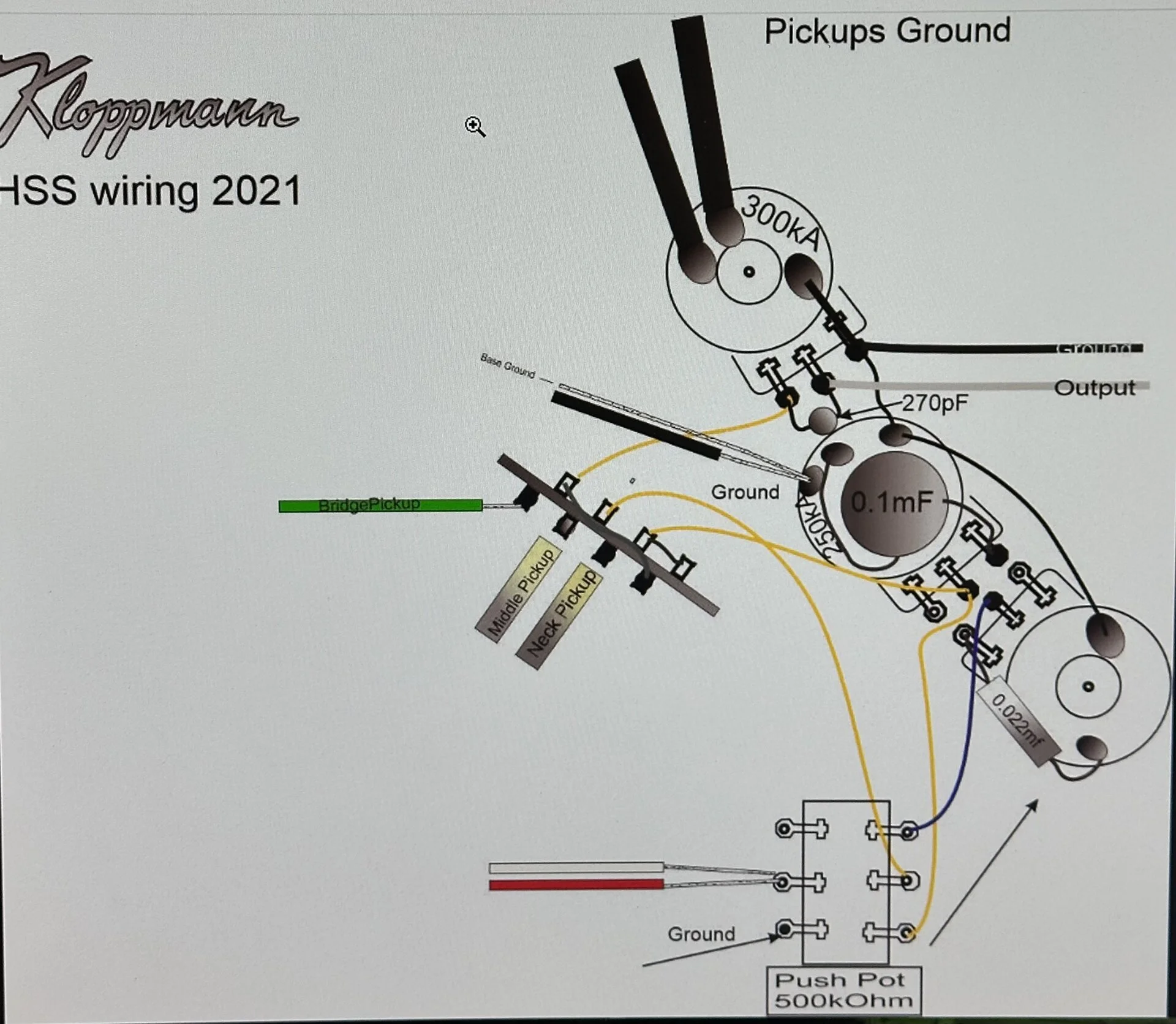 Ich hatte mir vorgestellt, den Humbucker mittels Push Push Poti zu splitten. Als Vorlage habe ich die HSS 2021 Schaltung von Kloppmann genommen. Leider funktioniert das nicht. Irgendwie ist da was verkehrt.