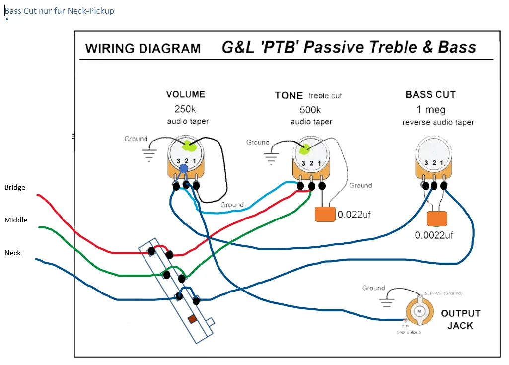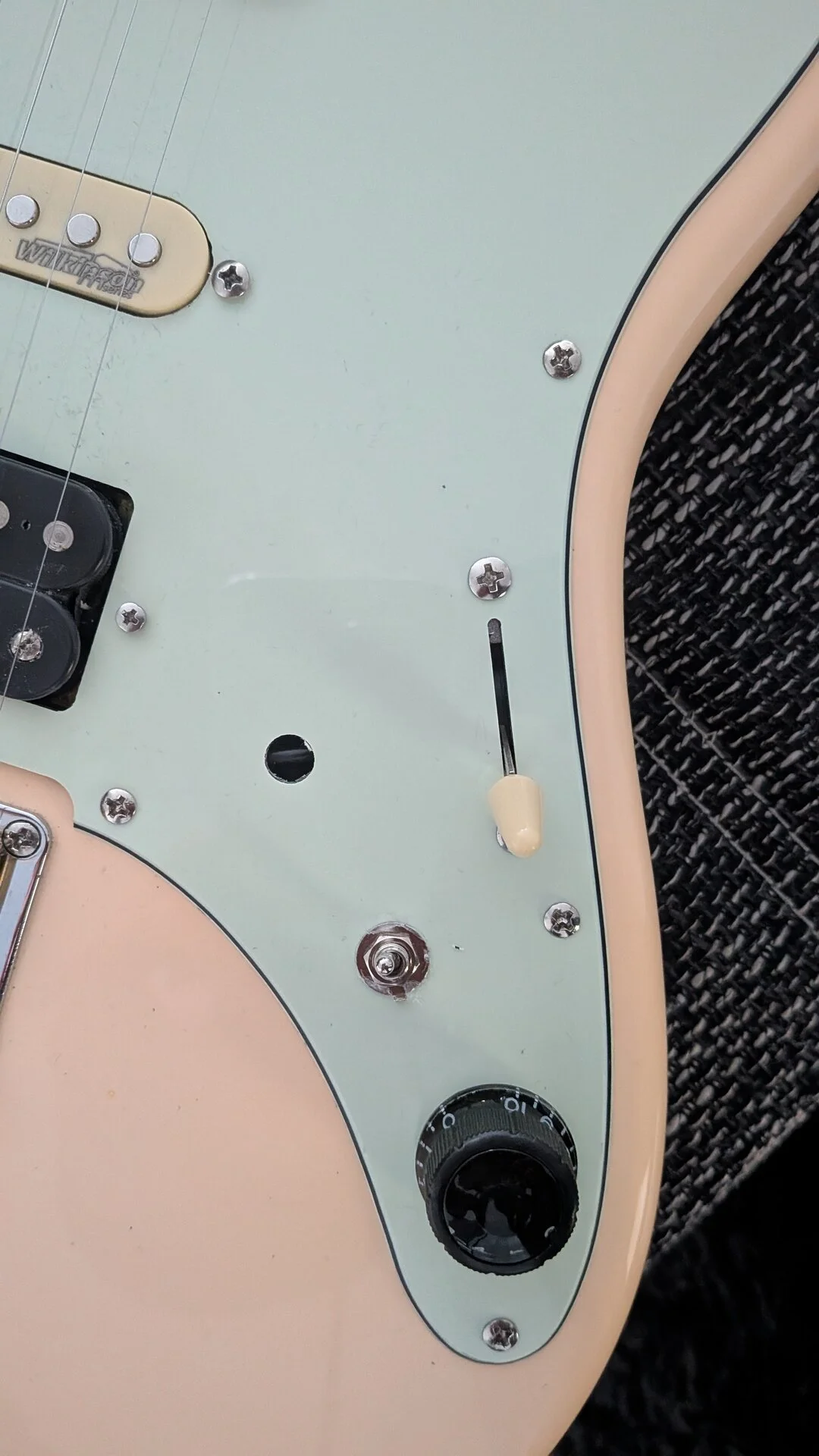 Jetzt werkelt da ein 3 Wegeschalter (Telestyle) mit einem Volumepoti. Der Minischalter macht einen Basscut am Halshumbucker (was in der Mittelposition des 3 Wegeschalters ein leicht out of phase töniges Klangbild erzeugt). Pickups zur Zeit der Fast Track am Hals (find ich sehr gut) und ein Air Classic (alles DiMarzio) am Steg. Letzterer is jetzt auch nicht soooooo… Mal gucken. Vielleicht doch P90 im Humbuckerformat?