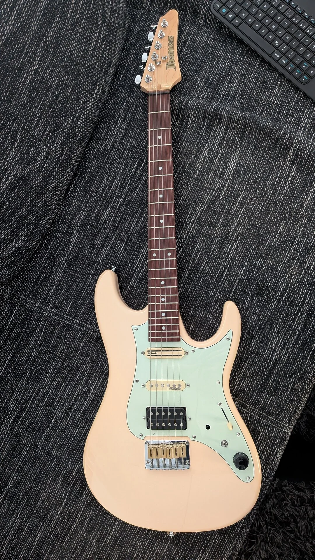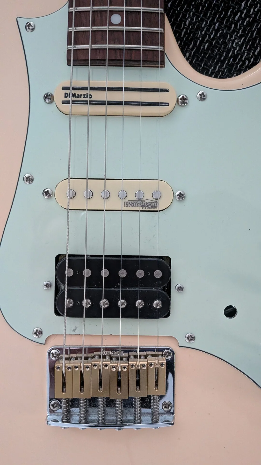 So, aber die Pickups… Ich bin ja nicht so der Fan von SCs, also kurzerhand mal bei Kleinanzeigen nach den DiMarzio’s Humbucker im Singlecoilformat geguckt. Weil neu zu teuer, so kann man die quasi ohne Verlust bei Nichtgefallen weiterverkaufen. Dann die Ernüchterung: Ibanez hat mal die Maße für die SCs so ein paar mm geändert; sowohl die Länge wie auch der Lochabstand und Durchmesser. Also mit der Feile …. Und das nächste Desaster: Die Fräsung im Body ist nicht arg tief. Den Mittelpickup, den ich eh nie benutze und runterdrehen wollte, kann man nicht tief genug stellen, dass er mir nicht im Weg ist. Da kommt also ein Blender rein. Mittlerweile waren da einige drin (Fast Track, Chopper, Cruiser, Super Distortion) aber nie war mir der Stegpickup angenehm zum Rest. Immer so diese Hochmitten zu präsent. Vielleicht doch ein normaler Humbucker am Steg? Aber dieses ganze Pickguard dann zerstören? Meinl! Ha, da gibt es für 20€ ein Pickguard, und zwar von der 40er. Das passt wie Faust aufs Auge, wobei auch hier die Koniferen von Ibanez den Mittelpickup 5mm Richtung Hals versetzt haben (geht aber gerade so) und den Steg 2mm (geht auch gerade so). Also das (fast noch) originale Pickguard ausgebaut, mit der original Schaltung bestückt im Schrank verstaut.
