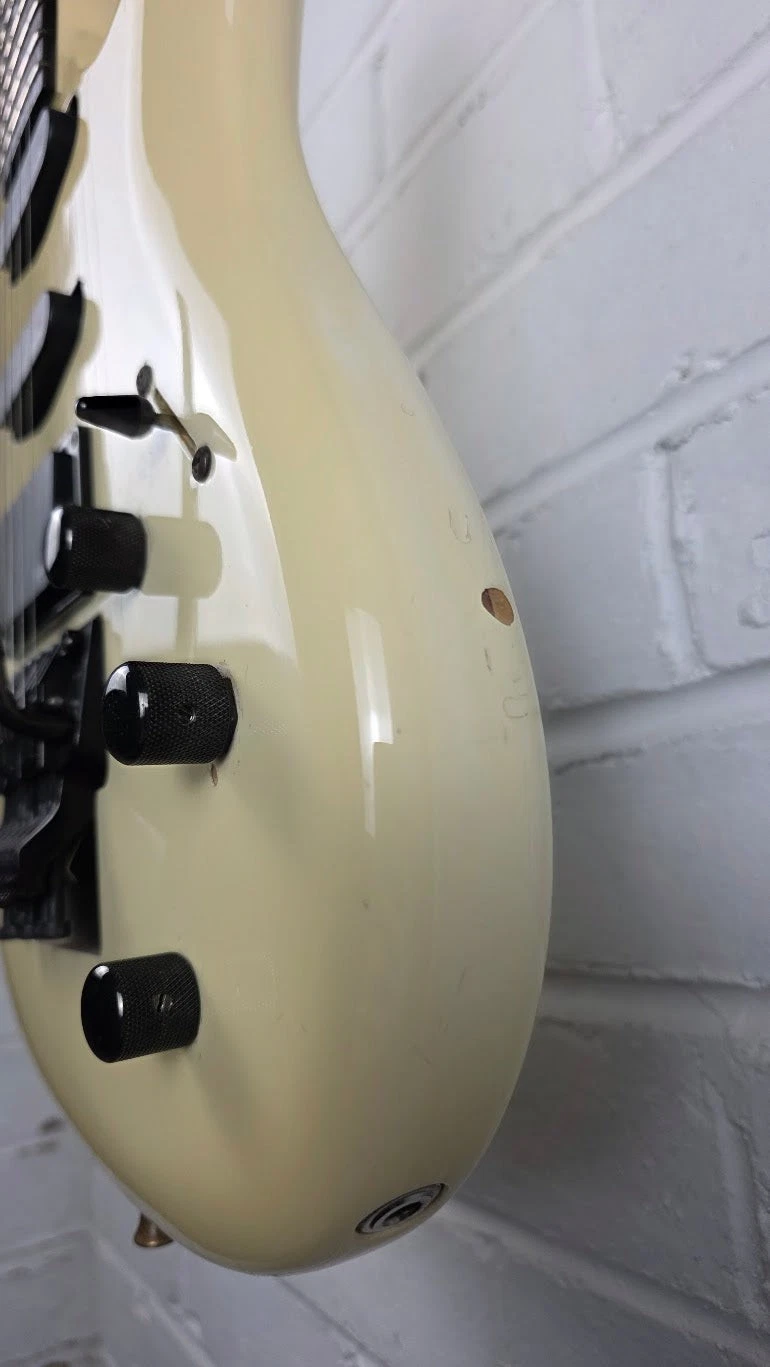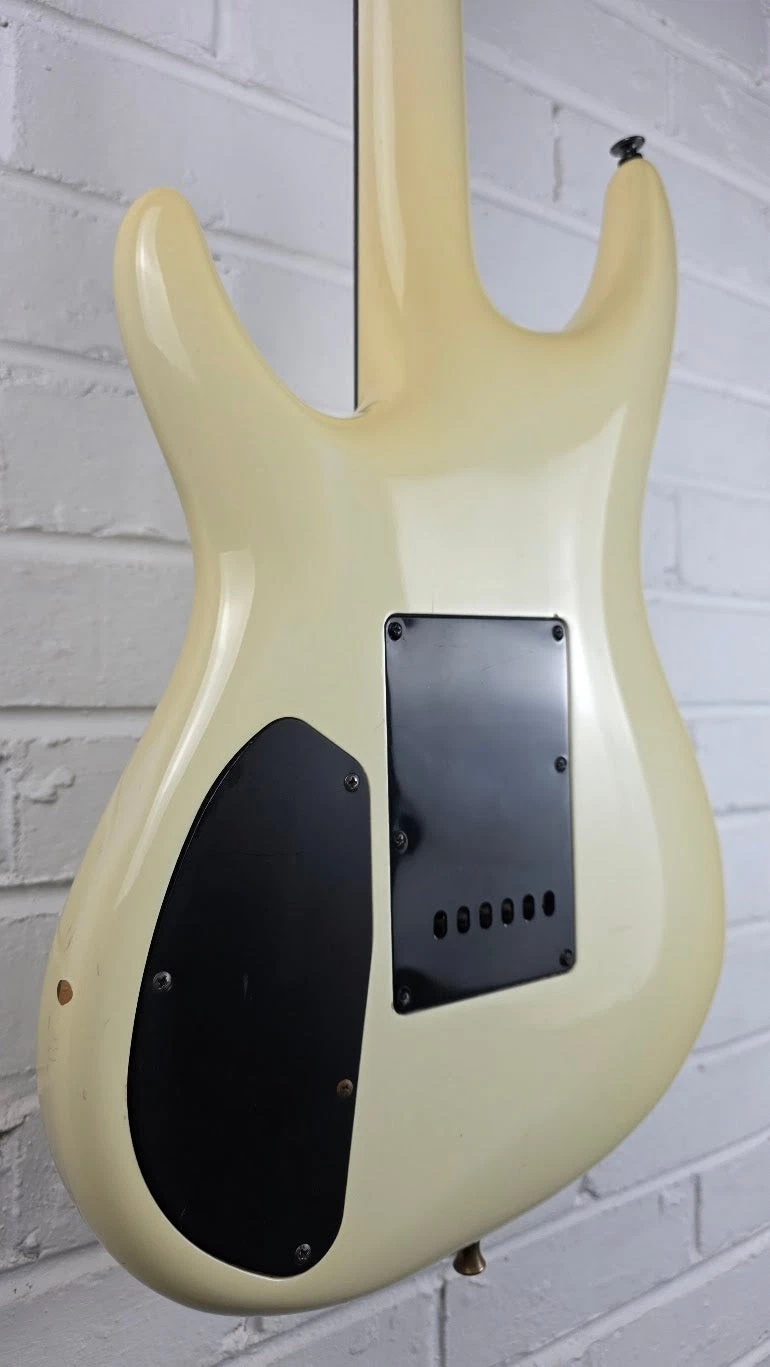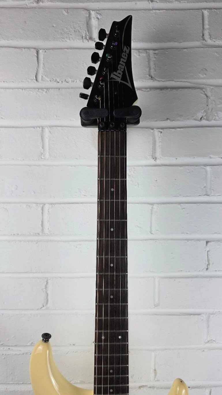 Crafted in Japan, this Ibanez RG-style electric guitar delivers classic shred-ready performance in a vintage cream finish. With a powerful HSS