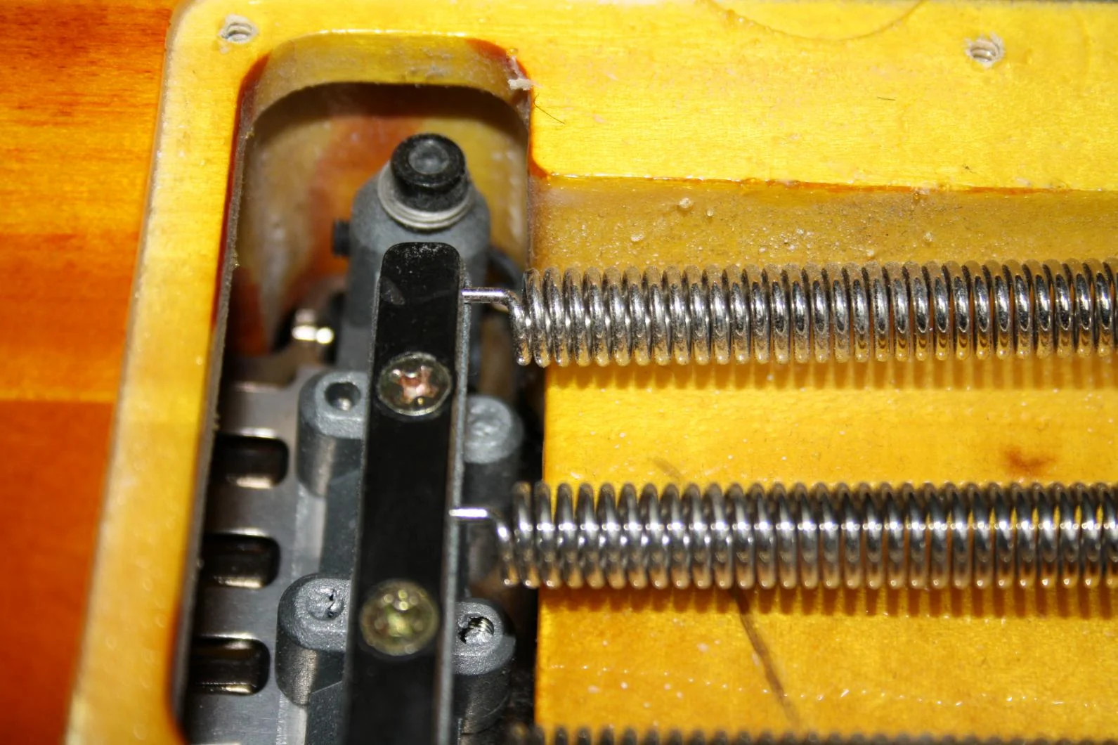 Auf dem angehängten Bild seht ihr das offene Vibratofach auf der Rückseite. Die Schraube links oben soll die "Arm-Saitenlage" justieren, nun ist die Frage: Was ist das überhaupt? Ich habe jetzt schon ein wenig herumprobiert, aber nicht erkennen können was es genau einstellt, es ist auf jeden Fall nicht die Schraube, die einstellt wie leicht sich der Arm am Vibrato drehen lässt, diese Schraube sitzt woanders!